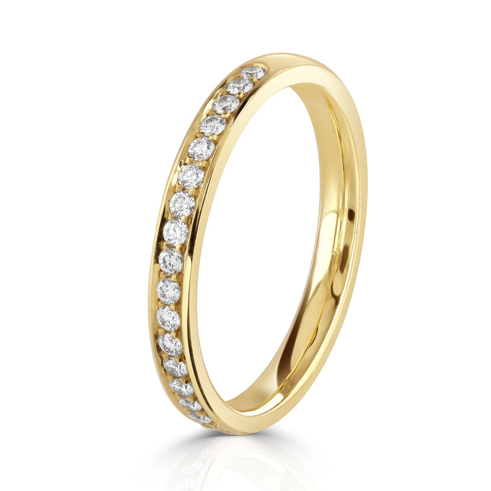 An elegant 18ct yellow gold court-shaped wedding ring, a timeless symbol of love and commitment, meticulously crafted for lasting beauty. This exquisite ring features a 2.5mm band, shaped in a traditional court style for comfort and enduring appeal, with a gentle curve both inside and out ensuring a perfect fit. Enhancing its elegance, the band is half micro-claw set with round brilliant-cut diamonds, totalling 0.19 carats. These diamonds are carefully arranged to catch the light from every angle, adding a subtle sparkle that complements the warm glow of the yellow gold. This wedding ring is ideal for those who seek a blend of classic charm and modern sophistication in their symbol of matrimony. Whether worn alone or paired with an engagement ring, it promises to be as enduring as your love, making every day a reminder of your special bond. Perfect for celebrating your wedding, anniversary, or any meaningful occasion, this yellow gold diamond-set wedding ring is a beautiful choice that will cherish for a lifetime.