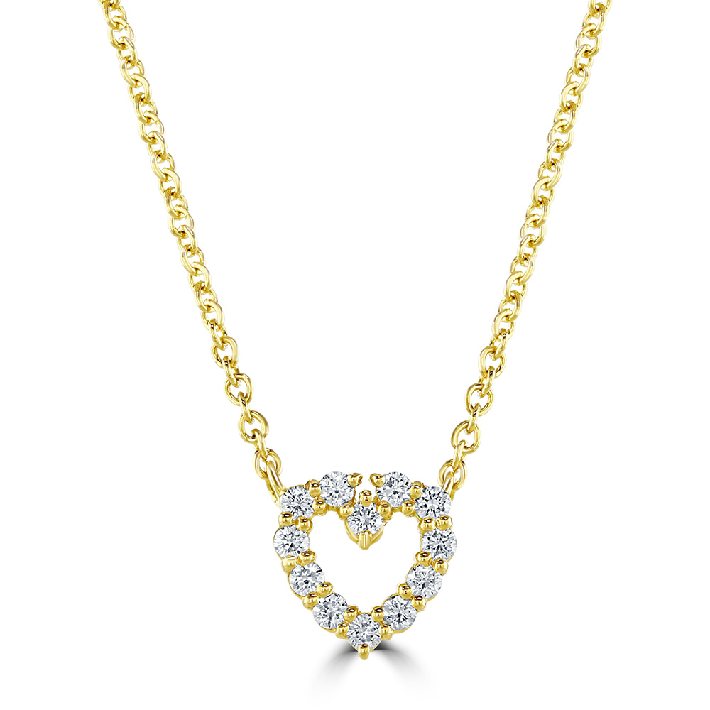 Our enchanting 18ct yellow gold open heart diamond pendant is a piece that embodies both classic elegance and contemporary charm. This exquisite pendant showcases an open heart design, intricately set with brilliant diamonds that total 0.25 carats. The diamonds are carefully arranged to highlight the heart's graceful contours and ensure a dazzling display of light.