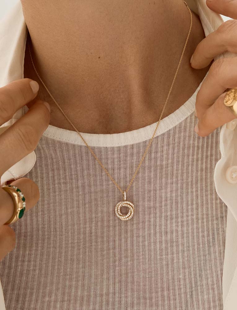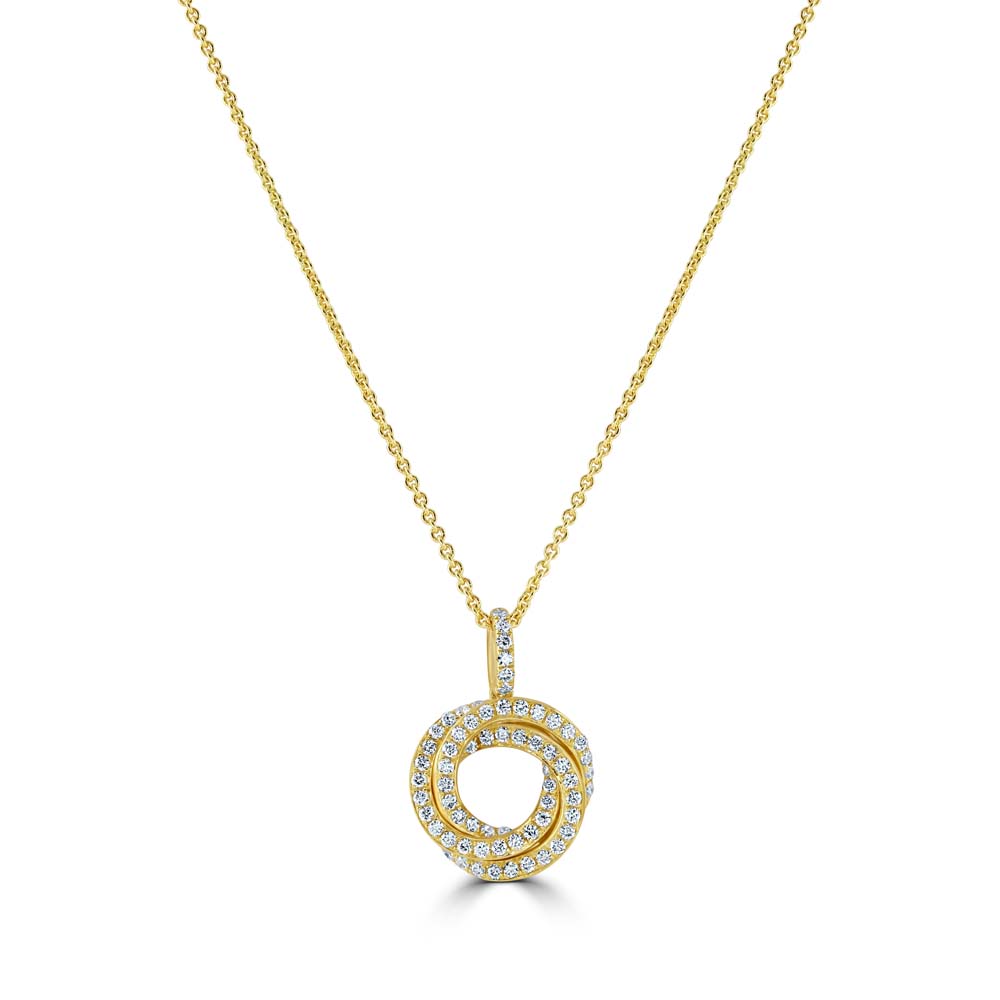 An exquisite 18ct yellow gold pendant that showcases two beautifully interlocking circles. Each circle is meticulously set with sparkling round brilliant cut diamonds, reflecting light with every movement. This pendant is gracefully suspended on an 18ct yellow gold trace chain, which is thoughtfully designed to be adjustable from 18 inches down to 16 inches, ensuring the perfect fit for any neckline.