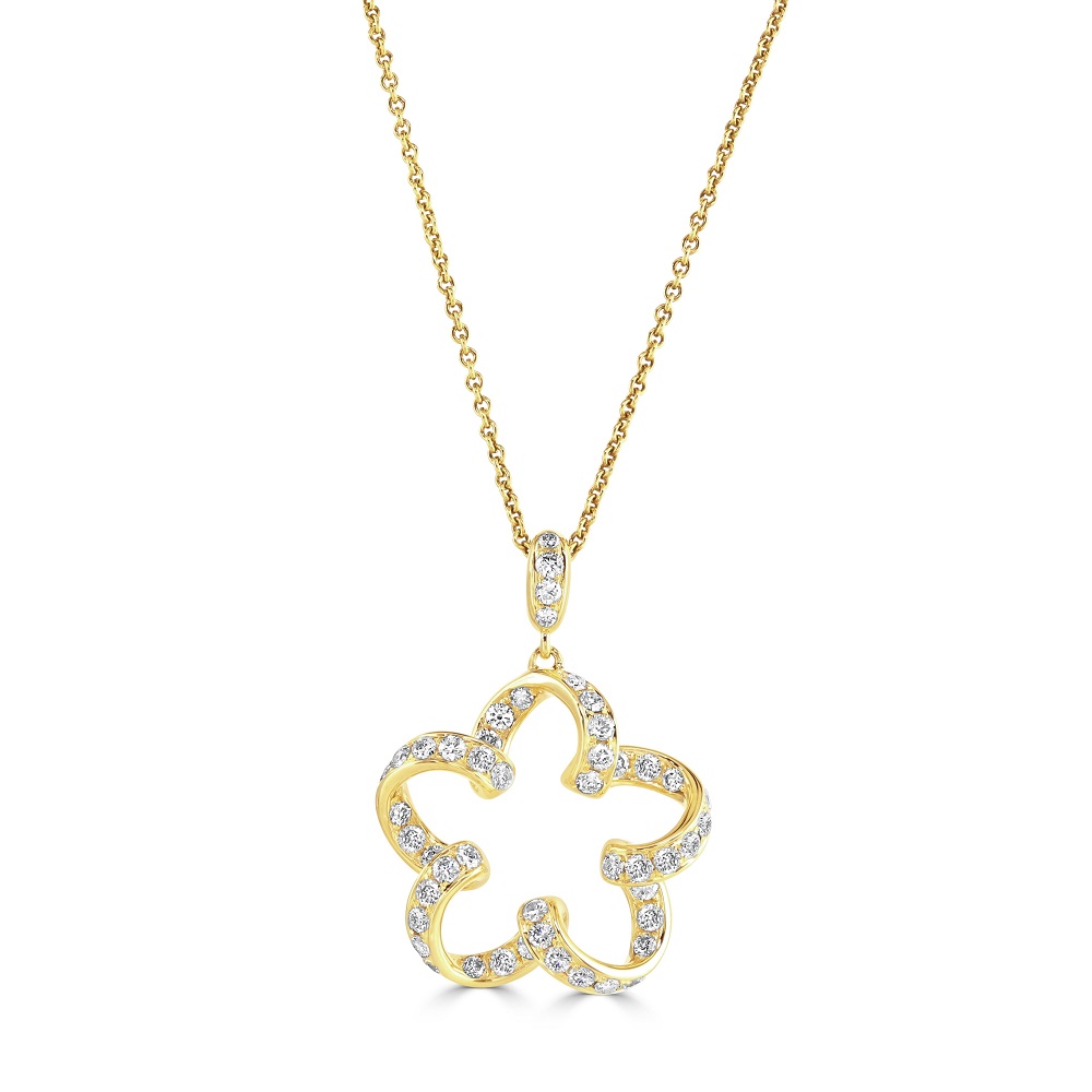 Exquisite and timeless, our 18ct yellow gold pendant encapsulates the beauty of nature in a sophisticated ribbon-style flower design. This pendant is elegantly adorned with sparkling diamonds set throughout the floral motif and the bale, totalling 0.66 carats of diamonds that shimmer with every movement. The piece is suspended from an 18-inch yellow gold trace chain, which can be adjusted to 17 inches for versatile wear. Perfect for those who appreciate delicate artistry and luxurious materials, this pendant is ideal for adding a touch of elegance to both everyday and special occasion ensembles. Embrace this stunning floral design as a standout addition to your jewellery collection, offering a blend of classic charm and contemporary appeal.