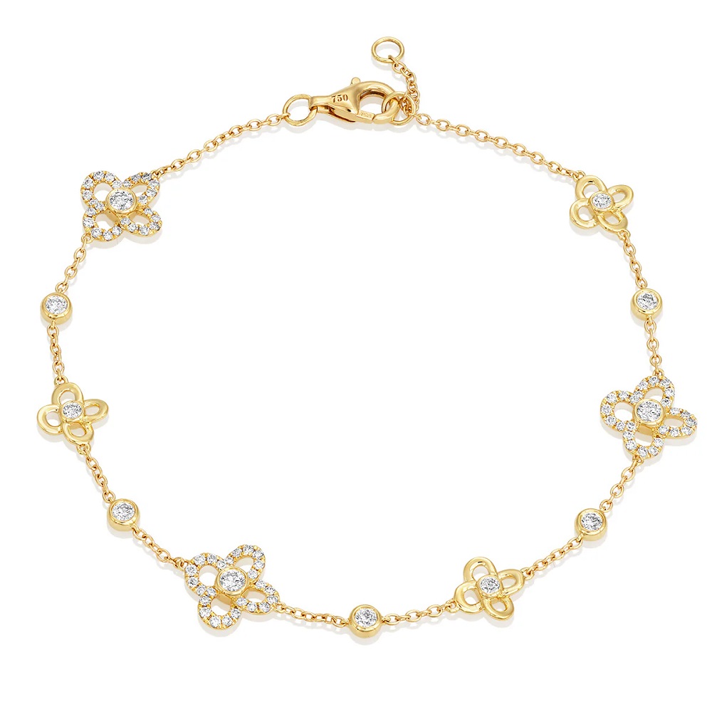 Delicate yet dazzling, this 18ct yellow gold trace chain bracelet is a celebration of refined craftsmanship and timeless design. Measuring 7.5 inches and adjustable to 7 inches for a perfect fit, it features a graceful sequence of alternating motifs that exude understated luxury. The design flows with rhythm and elegance: A full diamond-set flower, shimmering with intricate brilliance. Followed by a single rubover-set diamond, offering a sleek, modern contrast. Then a plain polished flower accented with a diamond centre, adding a touch of subtle sparkle. This trio of motifs repeats gracefully along the chain, creating a harmonious balance of texture and light. The bracelet is secured with a lobster clasp for both style and security.
