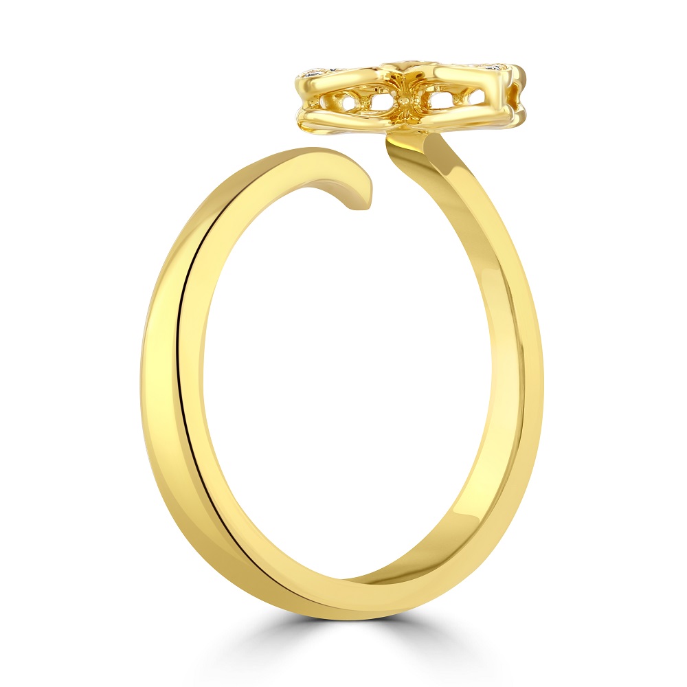 Our exquisite 18ct yellow gold open flower style crossover cluster ring, a stunning display of craftsmanship and elegance. This beautifully designed ring features a captivating open flower motif at the centre, highlighted by a rubover set round brilliant cut diamond. Surrounding this central diamond, smaller round brilliant cut diamonds are meticulously grain set to form four delicate petals, each sparkling with every movement. The ring’s unique crossover style extends to another cluster of grain-set round brilliant cut diamonds at the opposite end, enhancing the floral theme and adding an additional layer of brilliance. The entire piece is crafted in luxurious 18ct yellow gold, whose warm tones beautifully complement the shimmer of the diamonds, creating a rich and harmonious aesthetic. Perfect for those who appreciate intricate designs and the timeless appeal of yellow gold, this crossover cluster ring is a standout piece that makes a perfect gift for special occasions such as engagements, anniversaries, or as a treasured addition to your own jewellery collection.