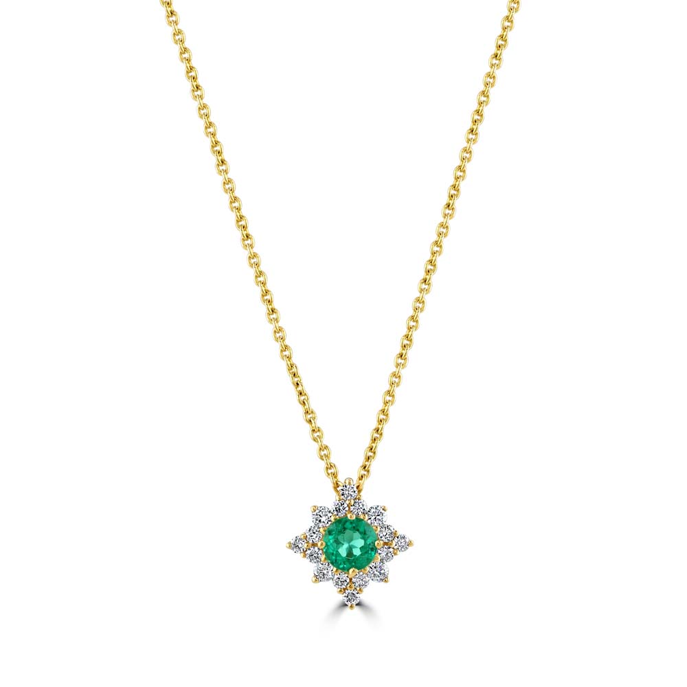 Elevate your jewellery collection with our 18ct yellow gold star-shaped pendant, a piece that beautifully marries classic elegance with a hint of celestial charm. At the centre of this dazzling star-shaped design sits a vibrant 4-claw set round emerald, weighing 0.29ct. This lustrous green gemstone is perfectly complemented by a halo of round brilliant cut diamonds, collectively weighing 0.19ct. Each diamond is meticulously claw-set to enhance the star’s radiance and allure. Crafted in rich 18ct yellow gold, the pendant hangs gracefully from an 18-inch trace chain, which can be adjusted to 16 inches to suit different necklines and styling needs. This feature ensures optimal versatility and comfort, making the necklace a superb choice for daily wear or special occasions. This pendant is an ideal way to add a touch of luxury and sparkle to any outfit. Whether it's a gift for a special occasion or a treat for yourself, this emerald and diamond star-shaped pendant promises to be a cherished addition to any jewellery collection, symbolizing sophistication and timeless beauty.