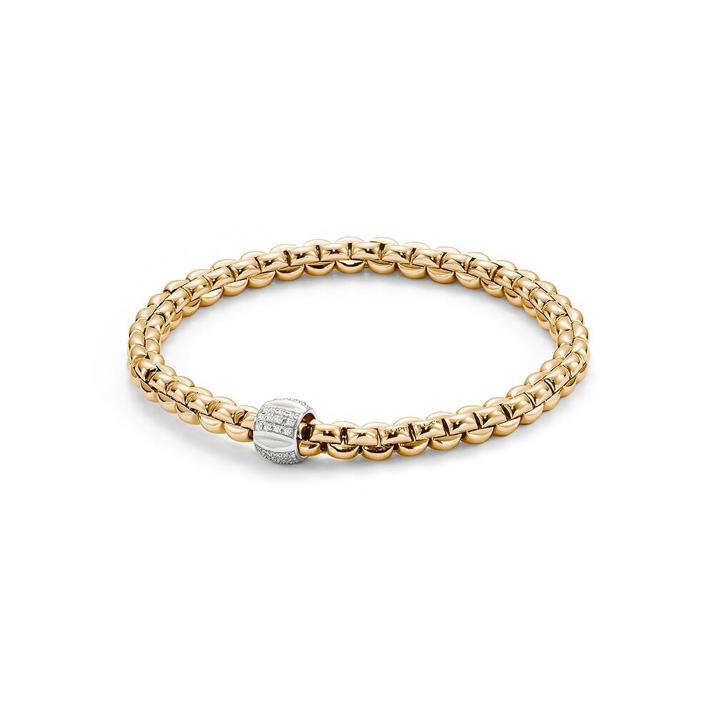 Discover the epitome of elegance with our 18ct yellow gold Flex'It Eka flexible bracelet from Fope Gioielli, a symbol of exquisite Italian craftsmanship. This luxurious bracelet features a unique flexible design crafted in sumptuous 18ct yellow gold, offering both comfort and impeccable style. The centrepiece of this stunning accessory is a white gold rondel, beautifully adorned with four sections set with sparkling diamonds, totalling 0.24 carats. This design element adds a touch of sophisticated glamour, making the bracelet a versatile piece suitable for both casual chic and formal attire. Ideal for those who appreciate refined aesthetics and innovative design, this bracelet is a standout addition to any jewellery collection, blending timeless beauty with contemporary flair.
