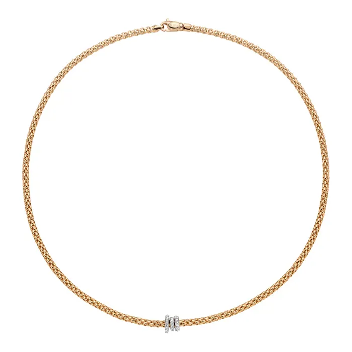 Embrace the luxurious blend of classic elegance and contemporary design with our 18ct yellow gold flexible necklace from Fope Gioielli's Flex'It Prima Collection. This exquisite necklace features three oval-shaped rondels crafted in sophisticated white gold, each pavé set with shimmering round brilliant cut diamonds, totalling 0.31 carats. The diamonds are expertly arranged to enhance sparkle and add a touch of glamour to the piece. Measuring 43cm in length, this necklace is crafted with a flexible design that comfortably contours to your neckline, ensuring a perfect fit. Ideal for those who appreciate refined style and the versatility of a mixed metal look, this necklace combines the warmth of yellow gold with the brilliance of diamonds in a seamless and elegant fashion.