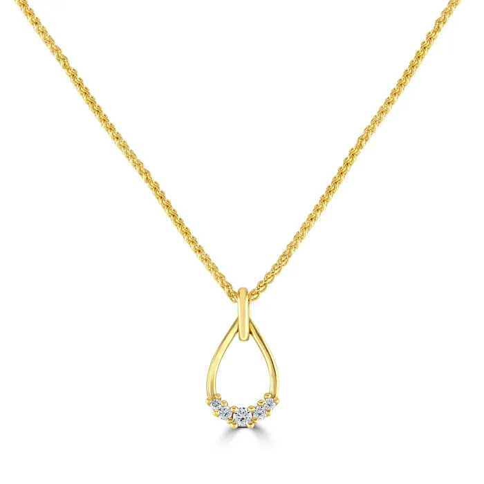 Introducing our stunning 18ct yellow gold open pear-shaped drop pendant, elegantly four-claw set with five graduated round brilliant cut diamonds. This exquisite piece is suspended from a luxurious 18ct yellow gold 18-inch Spiga chain, known for its strength and intricate weave that adds a touch of sophistication to the design. The pendant features a total diamond weight of 0.11ct, each diamond meticulously chosen to ensure maximum sparkle and allure. The open pear drop shape offers a modern twist on classic elegance, making this pendant a perfect choice for those seeking a unique and eye-catching piece of fine jewellery. Whether as a gift or a personal indulgence, this yellow gold diamond pendant is sure to enchant and delight any wearer, adding a radiant glow to any ensemble.