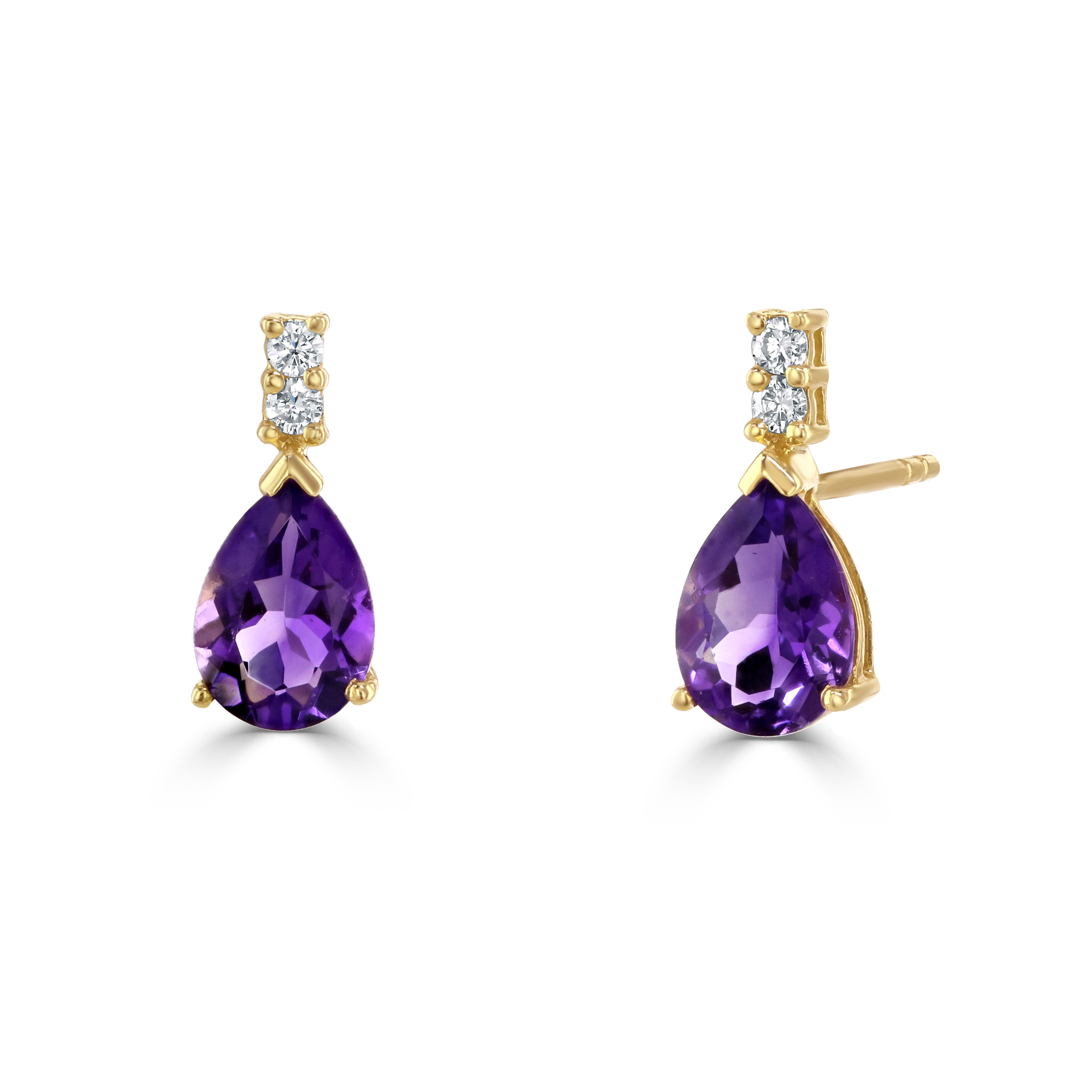 An elegant pair of 18ct yellow gold drop earrings, a dazzling creation that effortlessly combines timeless design with luxurious detail. Each earring features a stunning pear drop-shaped amethyst, meticulously claw set to showcase its deep, rich purple hue and captivating brilliance. With a total amethyst weight of 1.20ct, these earrings are a celebration of luxury and sophistication, making them a perfect addition to any jewellery collection. Accentuating the allure of the amethysts, two round brilliant cut diamonds are delicately set at the top of each earring, adding a touch of sparkle and refinement. Crafted in lustrous 18ct yellow gold, these drop earrings exude warmth and opulence. The post and butterfly fittings provide secure and comfortable wear, making these earrings an ideal choice for both everyday elegance and special occasions.