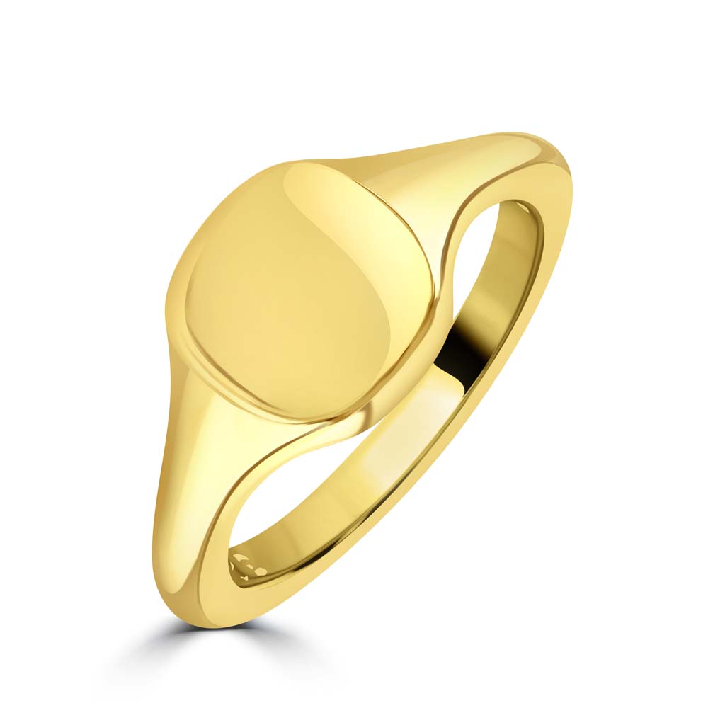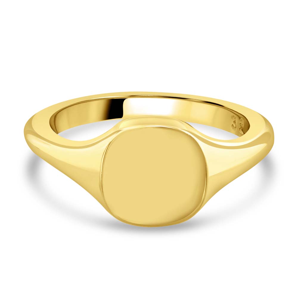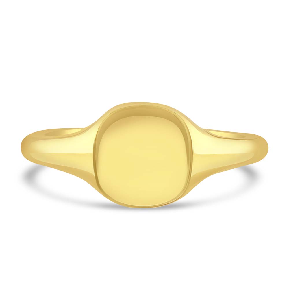 An 18ct yellow gold plain cushion shaped signet ring, a symbol of refined taste and personal heritage. This exquisite piece is perfectly designed for seal engraving, allowing you to customize it with your family crest or initials, making it a profound expression of your identity and legacy. Crafted from luxurious 18ct yellow gold, this signet ring features a sleek, cushion-shaped face that provides a canvas for personalization while maintaining a classic and sophisticated profile. Ideal for those who appreciate the significance of heritage and the importance of individuality, this ring is not just a piece of jewellery, but a personal emblem that can be treasured for generations.
