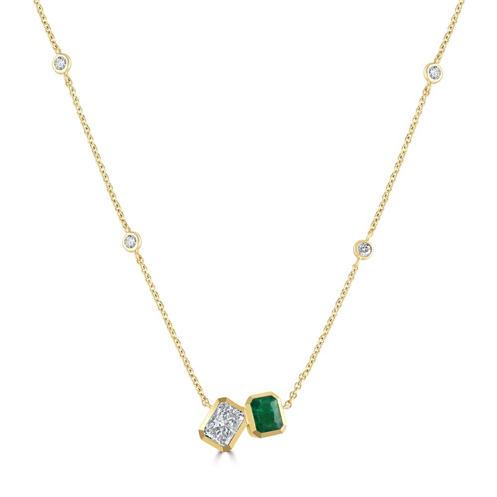 Discover timeless elegance with this 18ct yellow gold pendant necklace, showcasing a stunning rubover-set cut-cornered rectangular modified brilliant-cut diamond (Certified 0.70ct, F/VS2) paired with a vibrant rubover-set emerald-cut emerald (0.49ct). The pendant is seamlessly integrated into a luxurious 16-inch yellow gold chain, adorned with six evenly spaced rubover-set round brilliant-cut diamonds, adding a touch of sparkle and sophistication. A perfect blend of classic design and modern craftsmanship, this piece is ideal for those who appreciate fine jewellery with certified quality and exceptional detail.