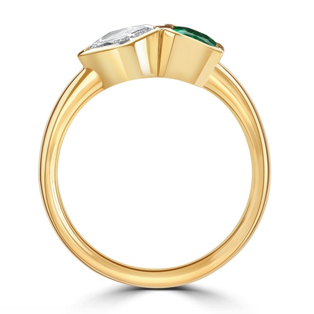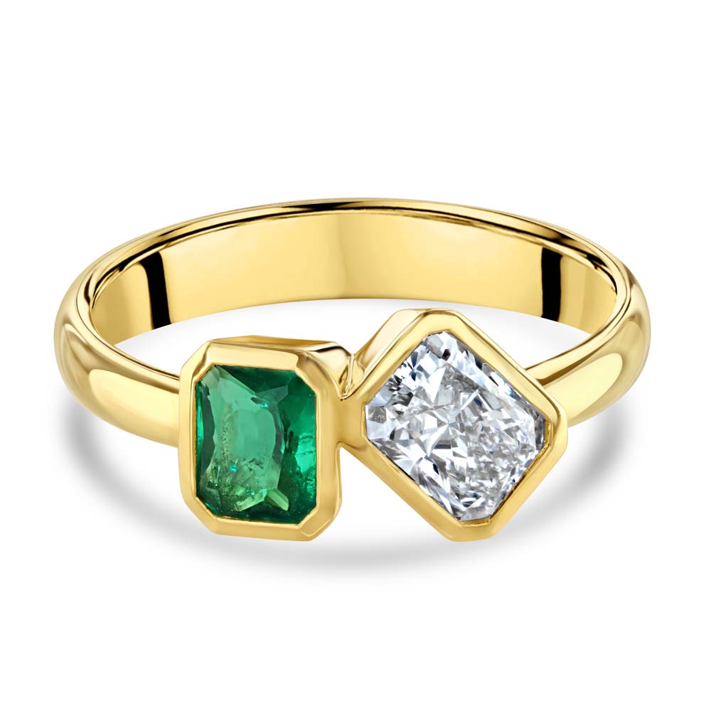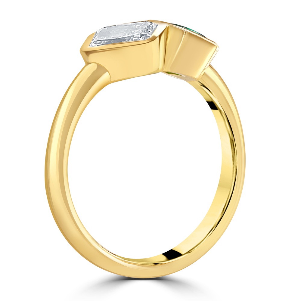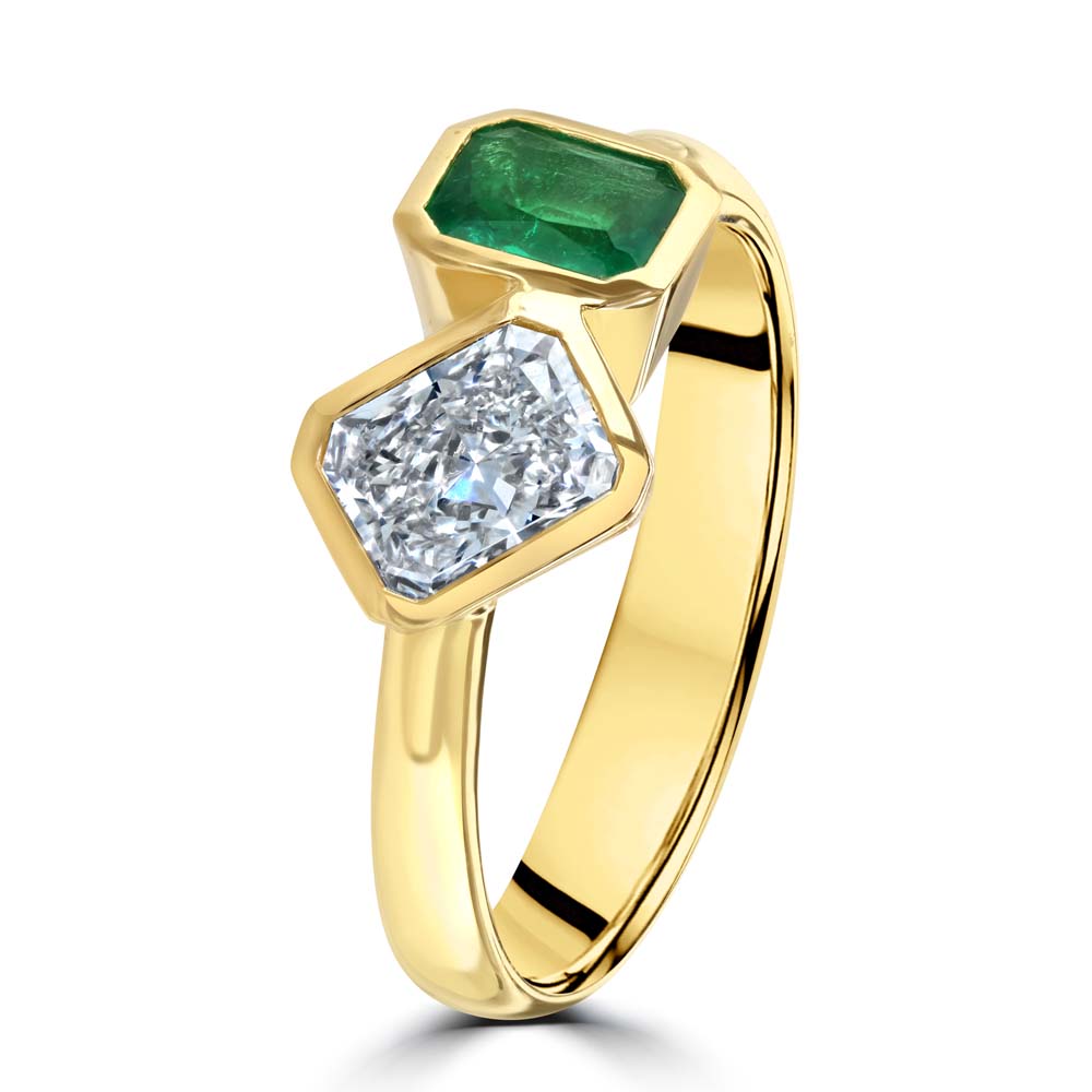 Experience refined elegance with this18ct yellow gold ring, featuring a striking combination of rare gemstones and contemporary design. At its centre lies a cut-cornered rectangular modified brilliant-cut diamond, weighing 0.70ct, with a dazzling F colour and VS1 clarity—expertly rubover set to enhance its clean lines and radiant sparkle. Paired alongside is a richly hued emerald-cut emerald, also rubover set, offering a vivid contrast of lush green against the warm glow of yellow gold. The sleek rubover settings lend a modern edge while ensuring both comfort and durability. This ring is a celebration of luxury craftsmanship, perfect for those seeking a distinctive piece that blends timeless beauty with bold sophistication.