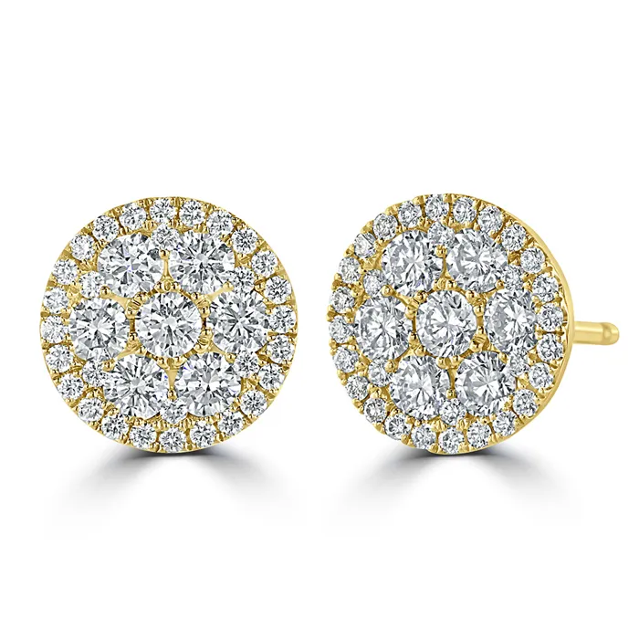 Indulge in the exquisite design of our 18ct yellow gold stud earrings, which feature a luxurious array of diamonds set in a stunning multi-halo arrangement. At the centre of each earring, a round brilliant cut diamond is prominently displayed, surrounded by a halo of six meticulously placed diamonds and an additional six smaller diamonds to fill the gaps. A final outer halo of round brilliant cut diamonds adds an extra layer of dazzling brilliance, bringing the total diamond weight to an impressive 0.87 carats. Crafted from rich 18ct yellow gold, these earrings enhance the fiery sparkle of the diamonds and offer a warm, opulent hue that complements any skin tone. Perfect for special occasions or adding a glamorous touch to everyday wear, these diamond halo stud earrings are a timeless addition to any jewellery collection, promising to captivate and charm with their intricate design and radiant glow.