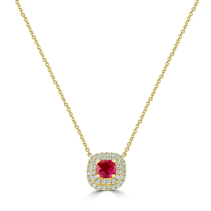 A luxurious 18ct yellow gold pendant, a masterpiece of elegance and craftsmanship. This stunning pendant features a centre cushion-shaped ruby, meticulously claw-set and weighing 0.75 carats. The ruby's vibrant red hue is beautifully framed by two concentric rows of dazzling round brilliant-cut diamonds, totalling 0.29 carats, which enhance the gemstone's radiance with their brilliant sparkle. This exquisite pendant hangs gracefully from an 18-inch chain, which can be adjusted to 17 or 16 inches for versatile styling options. Crafted from the finest 18ct yellow gold, this pendant combines classic charm with sophisticated allure, making it the perfect accessory for any occasion, from casual outings to more formal events. Ideal for gifting or as a cherished addition to your own jewellery collection, this pendant is sure to impress and delight.