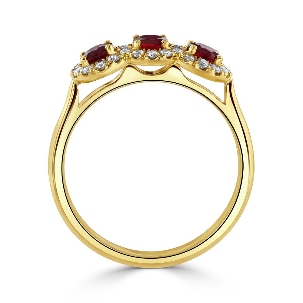 A divine 18ct yellow gold triple halo ring, a masterpiece of elegance designed to captivate and charm. This exquisite ring features three claw-set round rubies, totalling 0.69 carats, each encircled by a halo of dazzling round brilliant-cut diamonds, enhancing the vibrant red of the rubies. The total diamond weight of 0.22 carats adds an exceptional sparkle that complements the deep hues of the rubies perfectly. Crafted for a comfortable fit, this ring's intricate design and luxurious finish make it a stunning choice for engagements, anniversaries, or as a standout addition to any fine jewellery collection. Embrace timeless beauty and exceptional craftsmanship with this eye-catching piece.