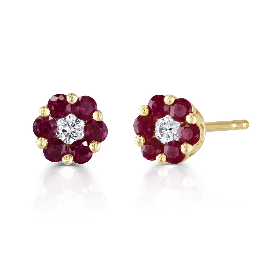 18ct Yellow Gold Ruby and Diamond Flower Earrings