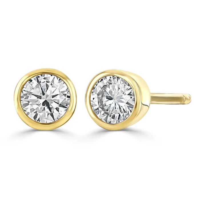 Crafted with precision, the rubover setting not only secures the diamond but also complements its radiant glow, creating a sleek and polished look that enhances the overall allure of the earrings. The yellow gold provides a classic and versatile backdrop that highlights the diamonds' clarity and enhances their visual impact.