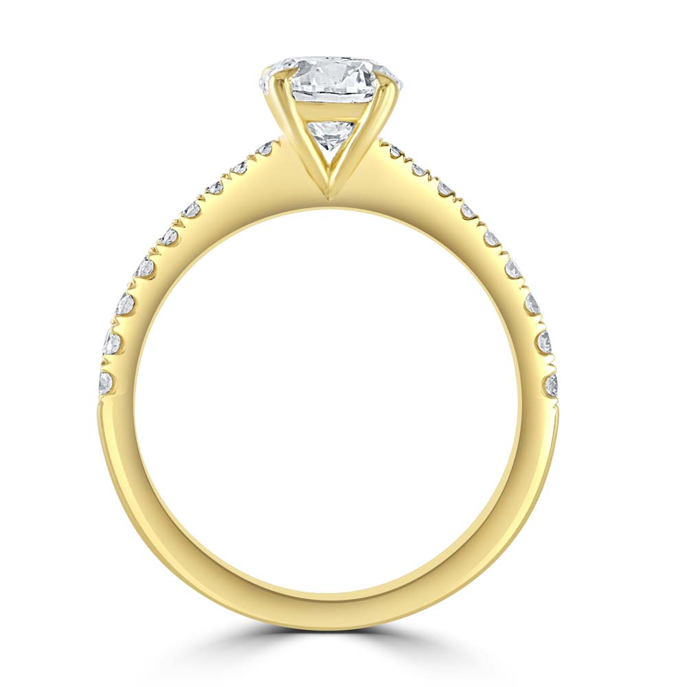 A timeless symbol of elegance and commitment, this 18ct yellow gold solitaire ring features a stunning 1.00 carat round brilliant-cut diamond, securely held in a classic four-claw setting. Graded D colour, SI1 clarity, and accompanied by a GIA certificate, the centre stone offers exceptional brilliance and purity. Enhancing the central diamond are nine graduated round brilliant-cut diamonds set into each shoulder, adding a graceful taper and sparkle. With a combined shoulder diamond weight of 0.23 carats, the design balances brilliance with refined detail, making it ideal for pairing seamlessly with a wedding band. Elegant, enduring, and meticulously crafted—this ring is a perfect expression of love and sophistication.