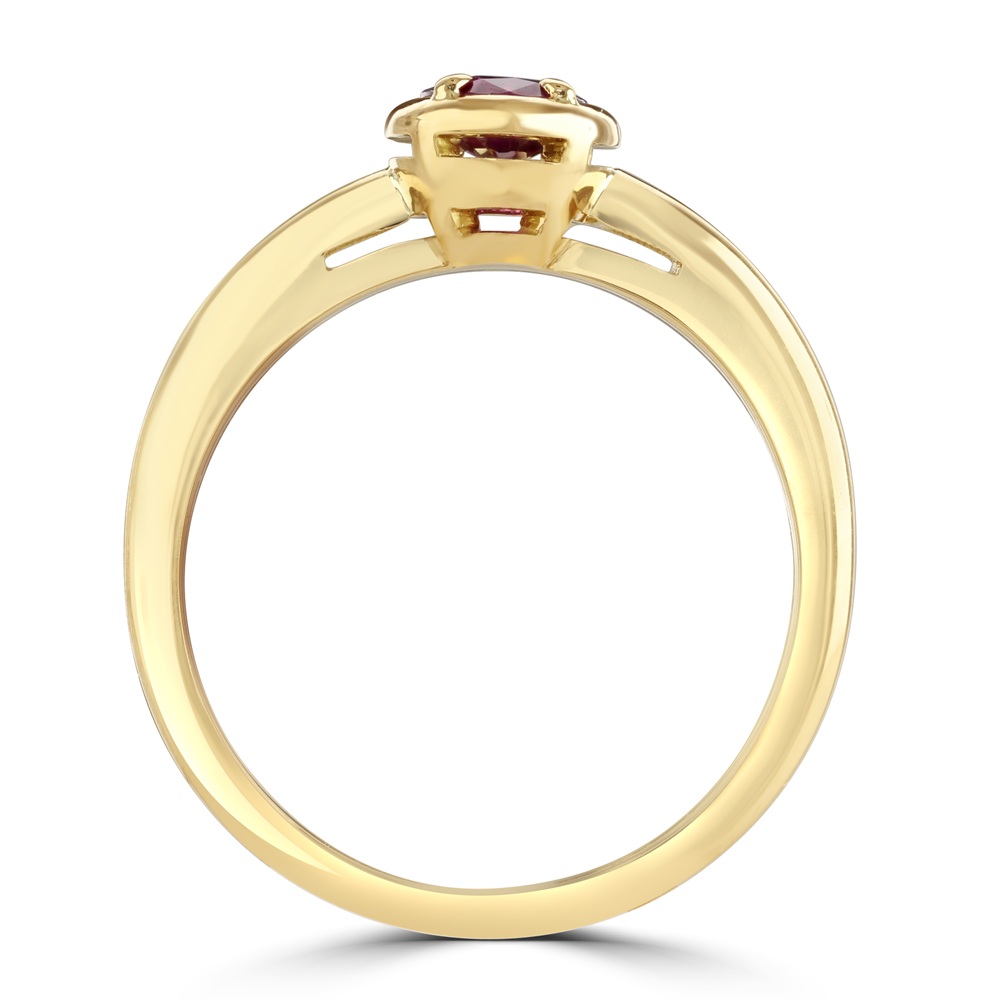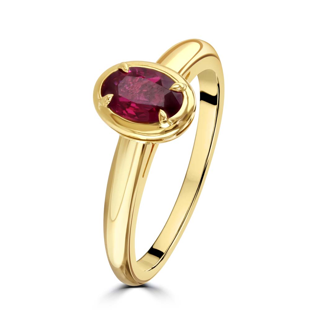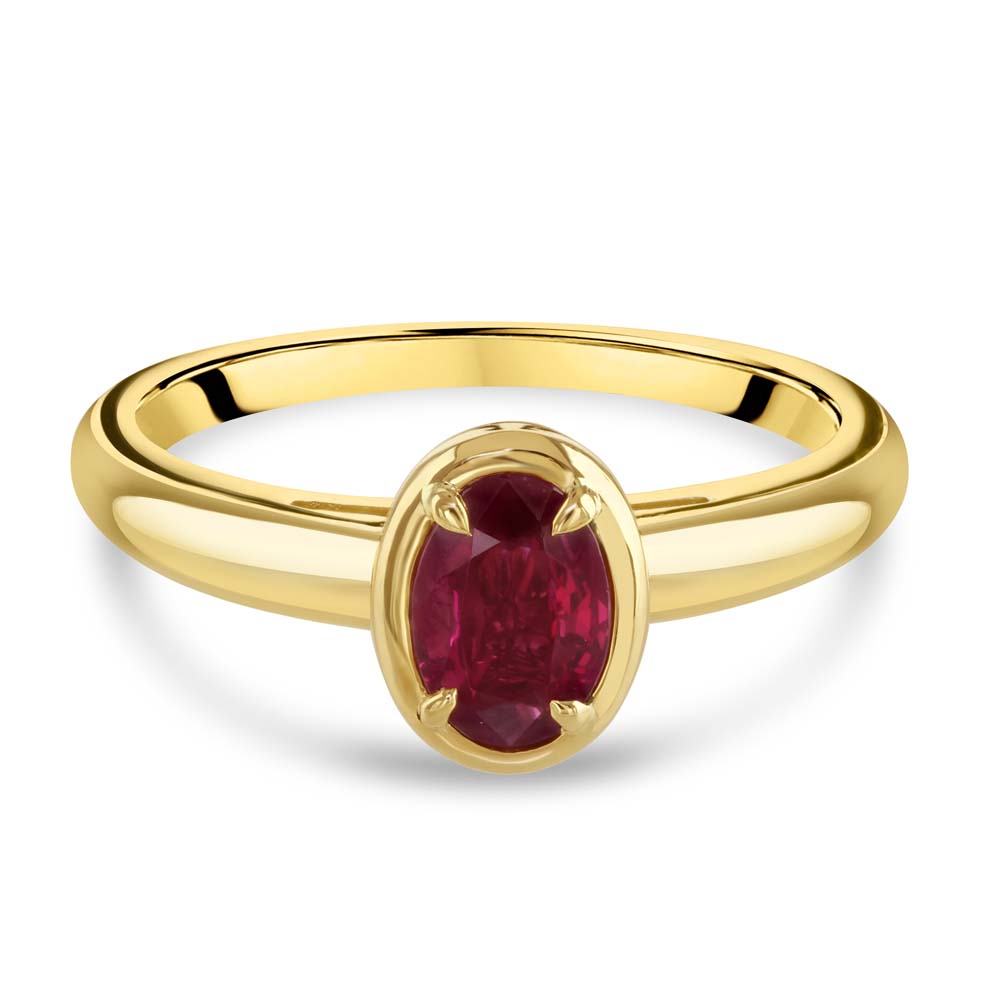 Experience timeless elegance with this exquisite 18ct yellow gold solitaire ring, featuring a captivating 0.69ct oval-cut ruby. Expertly set in a refined bezel setting with four delicate claws, the ruby radiates a rich, romantic red hue—symbolising passion, strength, and enduring love. The warm glow of the yellow gold enhances the vibrancy of the gemstone, creating a harmonious balance of colour and sophistication. This luxurious ruby ring is perfect as a statement piece, a romantic gift, or a unique engagement ring for those who seek bold beauty and classic design. A celebration of fine craftsmanship and rare gemstones, this piece is ideal for collectors and connoisseurs of high-end ruby jewellery.