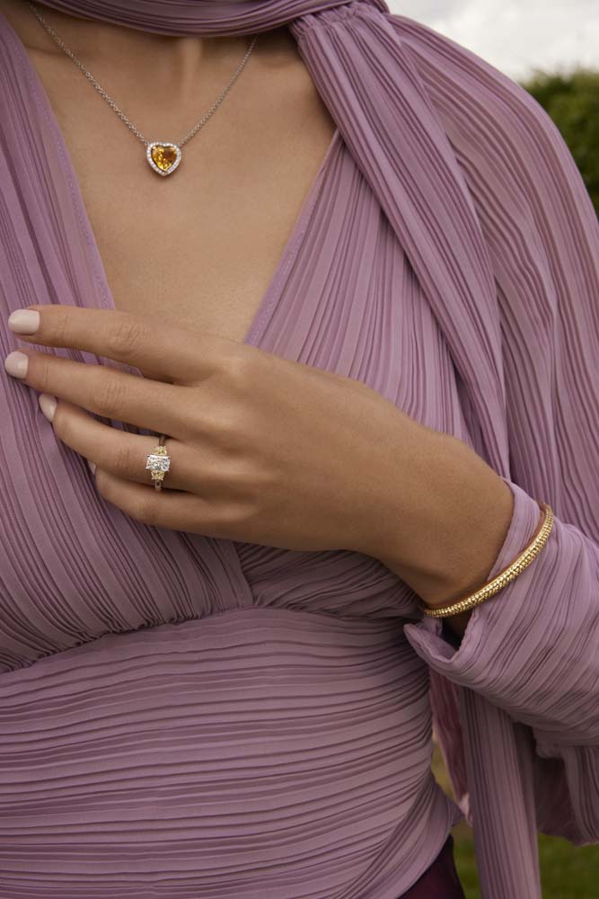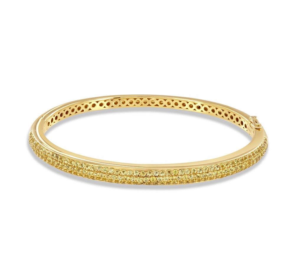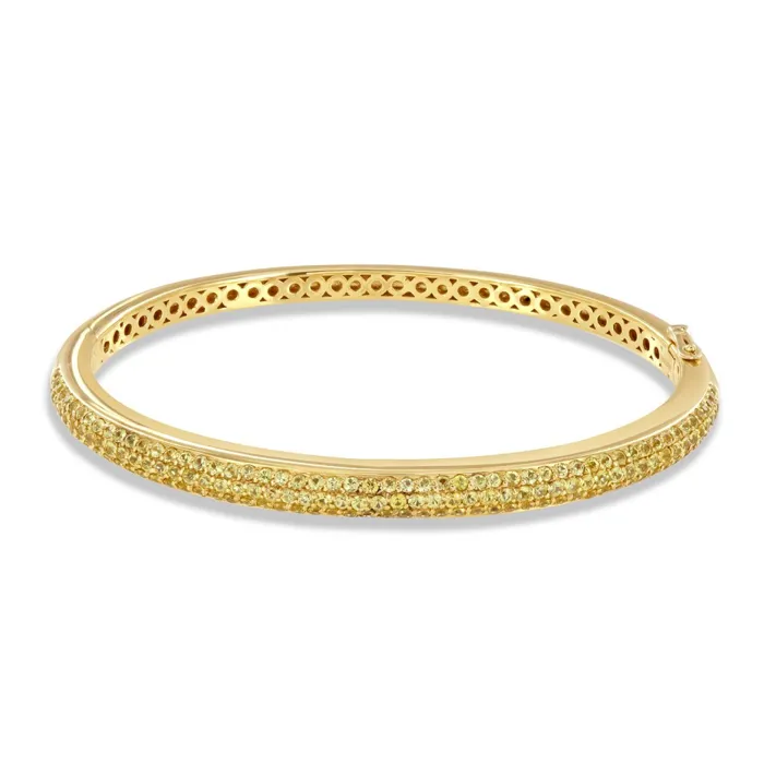 Designed for both comfort and style, the hinged oval shape ensures a snug fit while providing easy wearability. This piece is an ideal choice for those who appreciate fine craftsmanship and seek a statement accessory that combines classic charm with contemporary flair. Whether worn for a special occasion or as a daily splash of colour, this yellow sapphire bangle is sure to enchant and delight, making it a perfect addition to any fine jewellery collection.