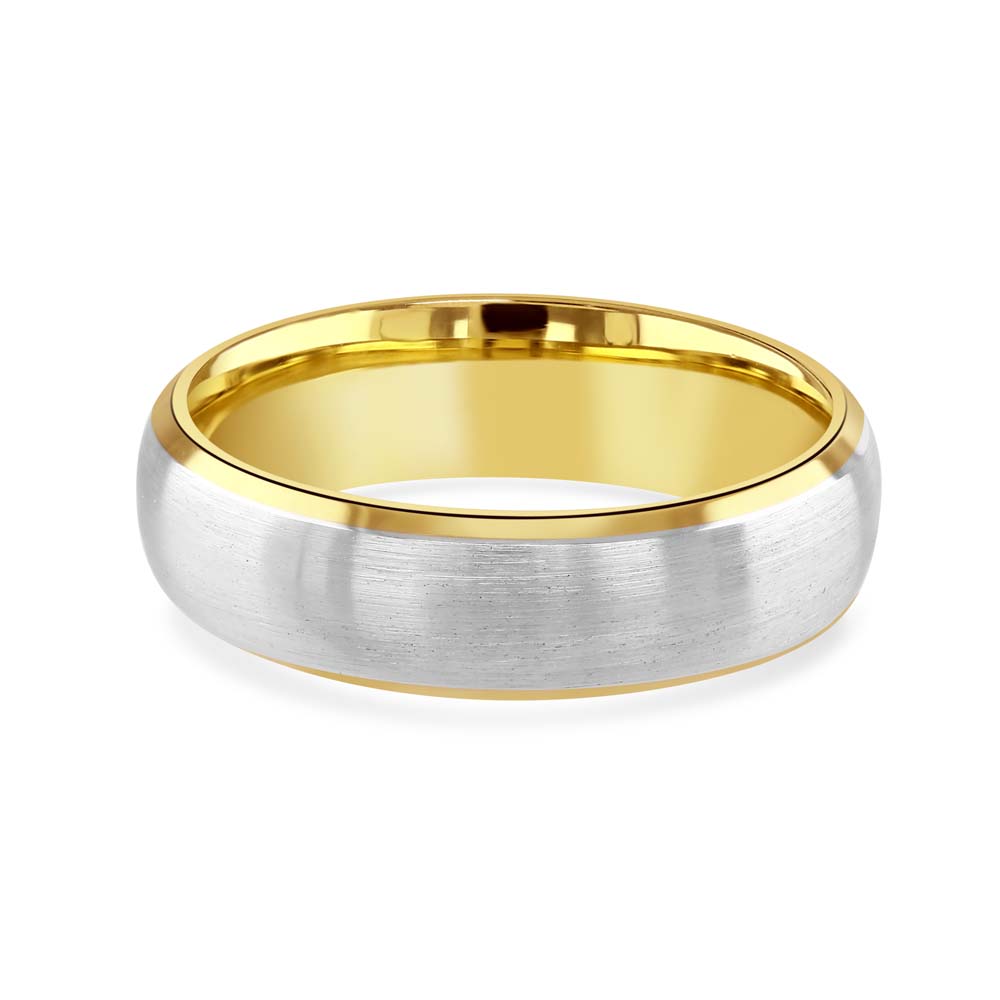 A contemporary style platinum satin finished wedding ring, elegantly accented with 18ct yellow gold polished bevelled edges. This exquisite ring perfectly blends the timeless allure of platinum with the warm glow of yellow gold, creating a stunning piece that is as unique as your love.