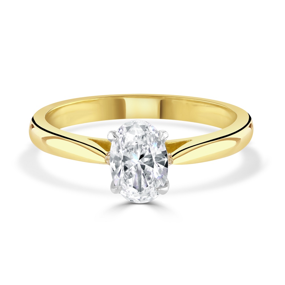 A beautiful solitaire engagement ring with an elegant, certified E colour oval cut diamond held in a bright platinum claw setting. The setting allows the maximum amount of light into the diamond to show off its fire and brilliance to its best. The 18ct yellow gold band has tapered shoulders which focuses the eye on the sparkling diamond. Like many of our rings this piece has been hand finished and set in in the UK. Other sizes and variations are available, please contact the store for more information.