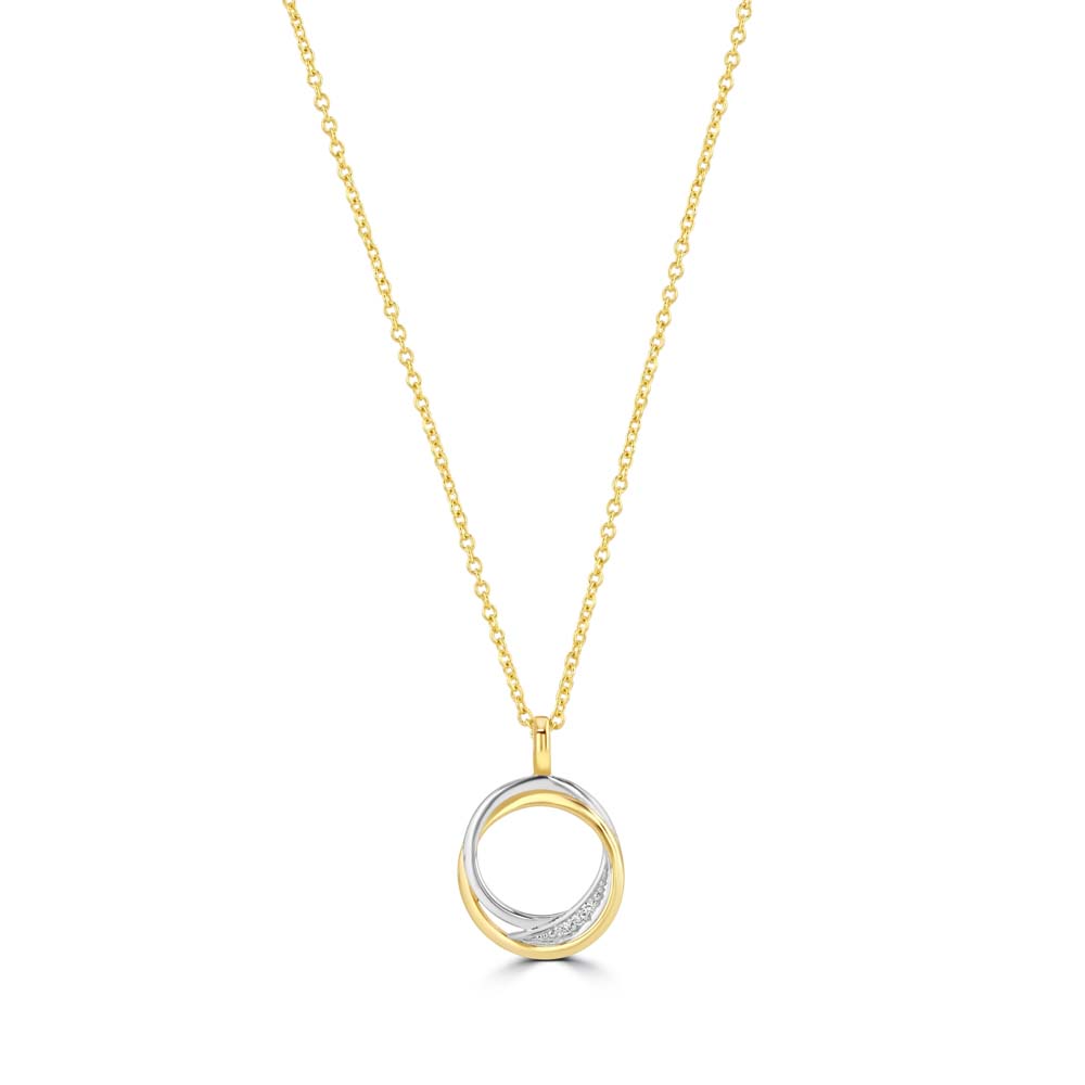 Introducing our stunning 18ct yellow and white gold pendant, featuring two intricately entwined plain circles, accented by a diamond-set half-moon. This sophisticated design is beautifully crafted, with the circles and half-moon creating a harmonious and elegant balance. Suspended from an 18 inch (adjustable to 17 inch) trace chain, this pendant is a testament to exquisite craftsmanship and timeless style. The half-moon sparkles with a total diamond weight of 0.015ct, adding just the right amount of brilliance to this minimalist yet captivating piece. Perfect for those who appreciate subtle luxury, this pendant offers a unique twist on classic shapes, making it a versatile and chic addition to any jewellery collection.