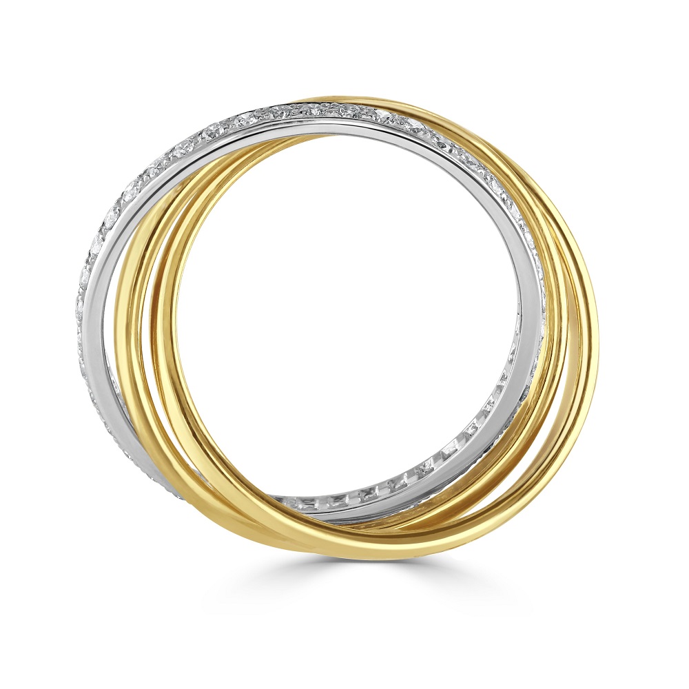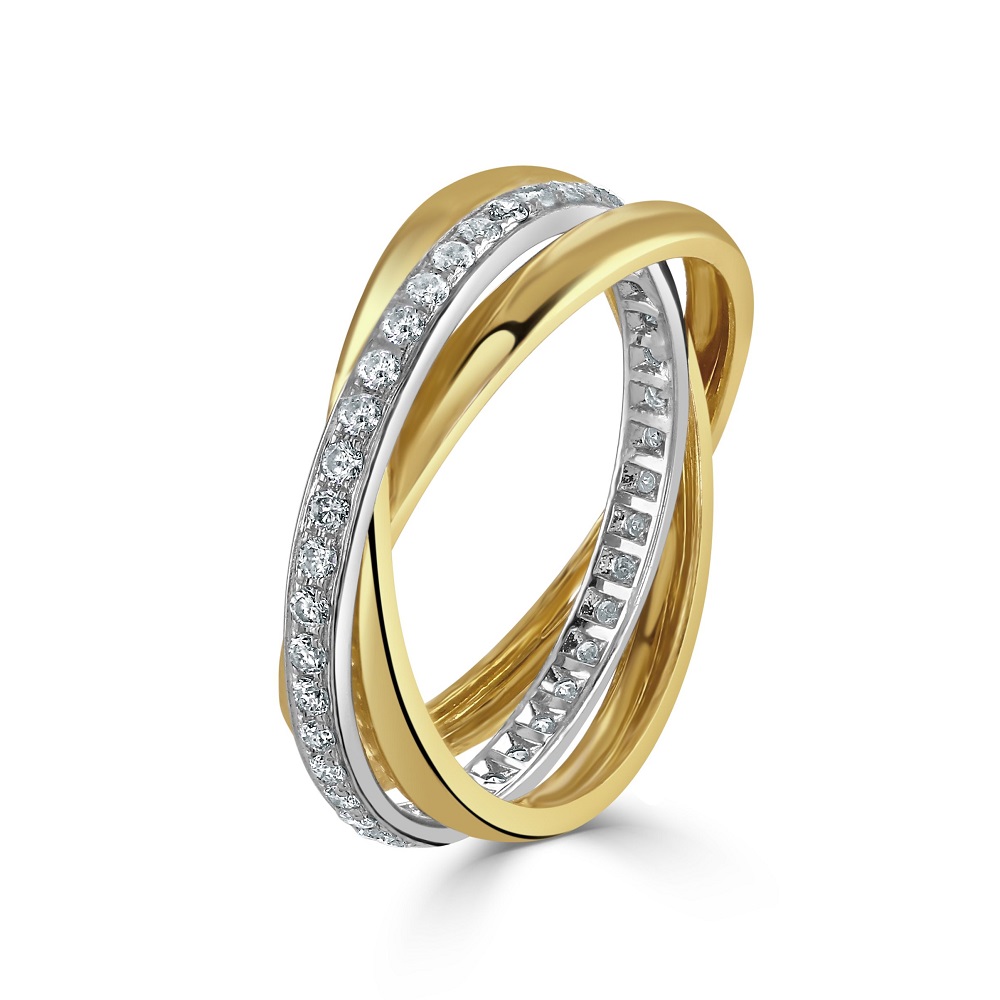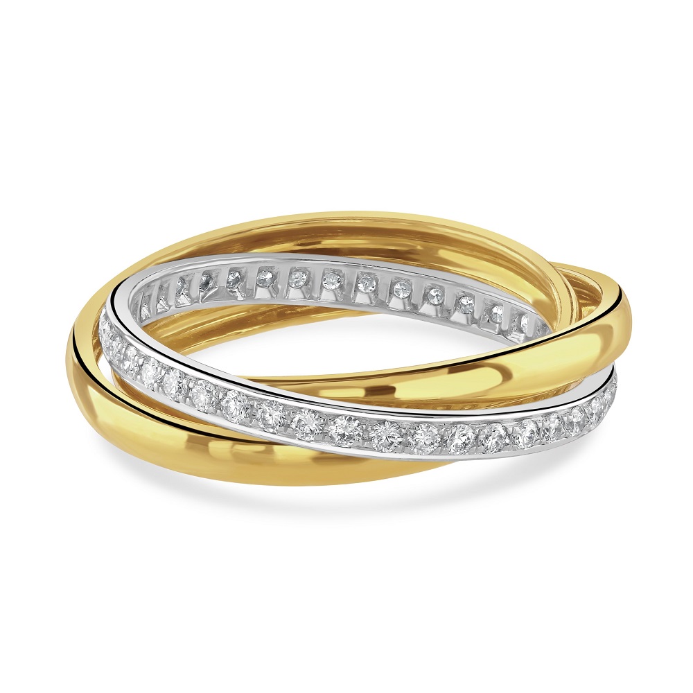 Discover the unique allure of our 18ct Gold Triple Band Style Ring, a striking fusion of sophistication and modern design. This exquisite ring combines two sleek 18ct yellow gold bands with a stunning 18ct white gold band, elegantly set with glittering diamonds totalling 0.42 carats. The contrast between the plain yellow gold bands and the diamond-encrusted white gold band creates a captivating visual harmony, making this ring a versatile addition to any jewellery collection. Ideal for those who appreciate a mix of classic and contemporary styles, this ring is perfect for everyday elegance or as a special occasion accessory. Elevate your ring collection with this beautifully crafted piece that promises to draw attention and admiration.