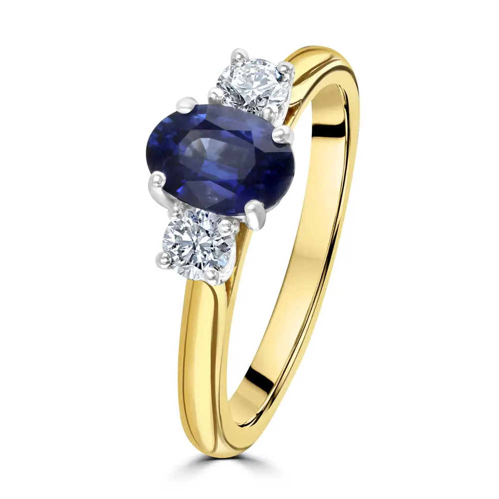 Timeless and elegant, this beautifully crafted trilogy ring is set in 18ct yellow and white gold, offering a classic contrast that enhances the brilliance of each stone. At its centre lies a 1.02 carat oval-cut sapphire, secured in a refined four-claw setting, radiating a rich and velvety blue hue. On either side, a round brilliant-cut diamond adds perfect symmetry and sparkle, with a combined diamond weight of 0.28 carats. The clean lines and balanced proportions of this design make it a sophisticated choice for marking life’s most meaningful moments. A graceful expression of love, legacy, and enduring style.