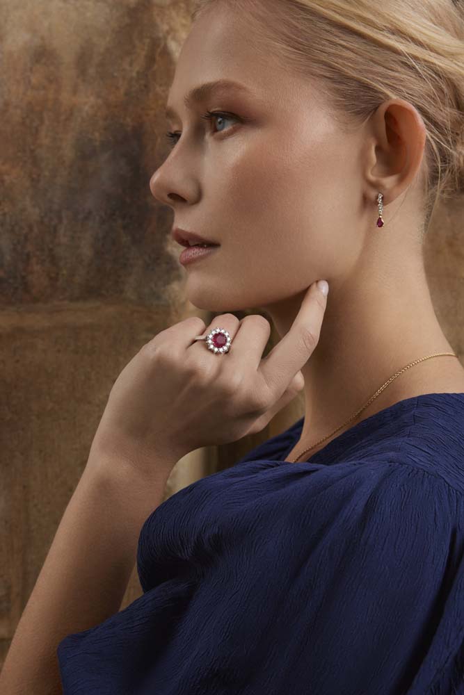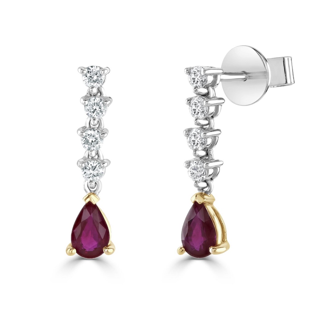 Our stunning 18ct white and yellow gold drop earrings feature a breath taking design that marries elegance with a touch of modernity. These earrings are adorned with four round brilliant cut diamonds, each meticulously three claw set in white gold, showcasing a total diamond weight of 0.32ct that radiates unmatched sparkle. The highlight is a singular pear-drop shaped ruby, gracefully set in yellow gold at the bottom of each earring, with a total ruby weight of 0.90ct, offering a vibrant splash of colour. Completed with secure post and butterfly fittings, these earrings are the epitome of sophistication, designed for those who appreciate the beauty of fine gemstones and the allure of intricate craftsmanship.