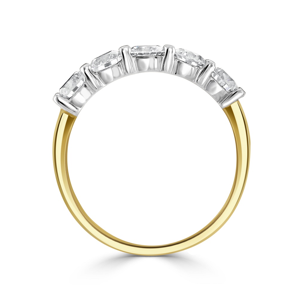 Explore the timeless allure of our 18ct yellow and white gold half eternity ring, expertly crafted to symbolize enduring love. This exquisite ring features five round brilliant cut diamonds, totalling 1.29 carats, each meticulously bar set to highlight their exceptional clarity and brilliance. The unique combination of yellow and white gold offers a striking, contemporary contrast, enhancing the visual appeal of the diamonds. Designed for those who appreciate elegant simplicity paired with luxurious detail, this half eternity ring is perfect for commemorating significant milestones or as a sophisticated addition to any fine jewellery collection. Whether worn daily or on special occasions, this ring promises to add a touch of sparkle and timeless elegance to your ensemble.