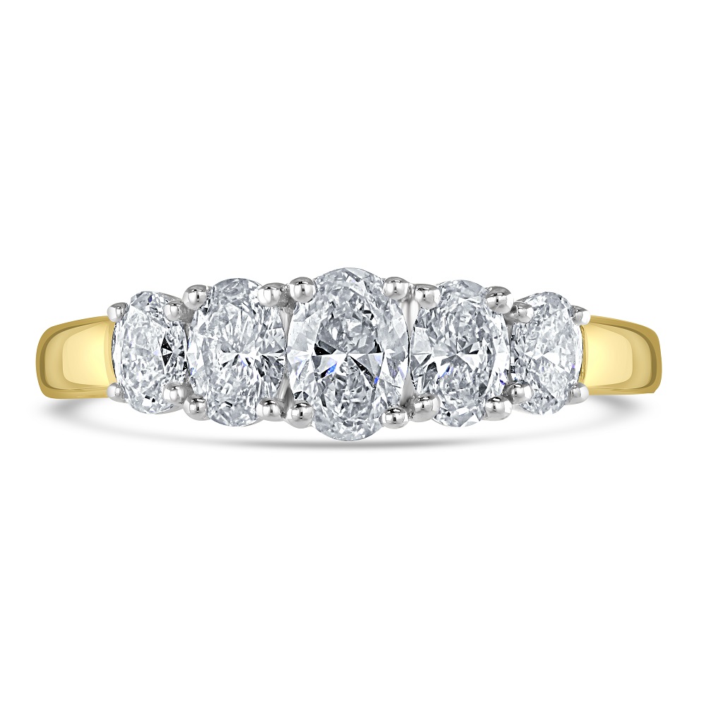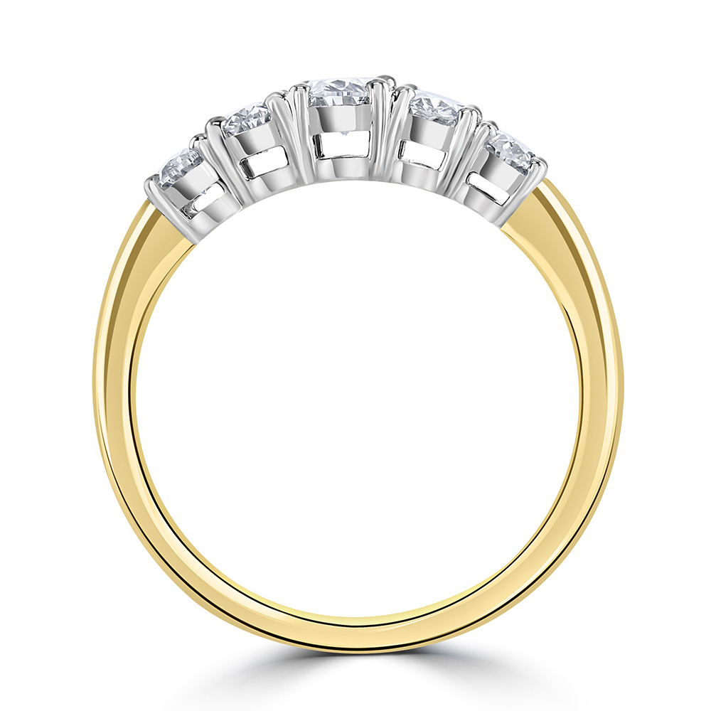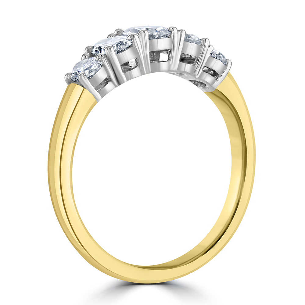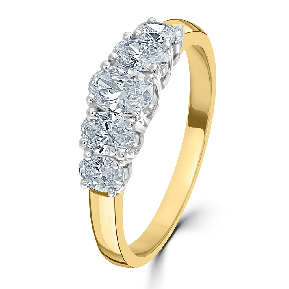 Discover the sophisticated charm of our 18ct yellow and white gold half eternity ring, a luxurious addition to any fine jewellery collection. This exquisite ring features five graduated oval cut diamonds, each expertly four-claw set to highlight their elegant contours and brilliant clarity. With a total diamond weight of 0.95 carats, these stones sparkle magnificently against the contrasting backdrop of yellow and white gold. The dual-tone design adds a contemporary twist to this classic eternity style, making it perfect for those who appreciate a blend of traditional and modern aesthetics. Ideal for an anniversary gift or as a timeless symbol of everlasting love, this half eternity ring embodies grace and enduring beauty.