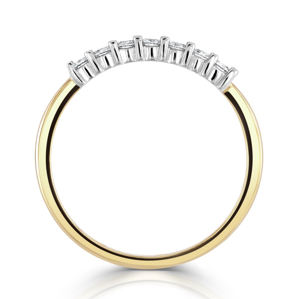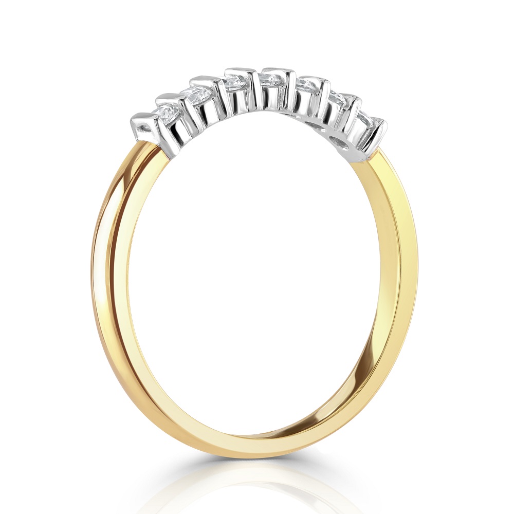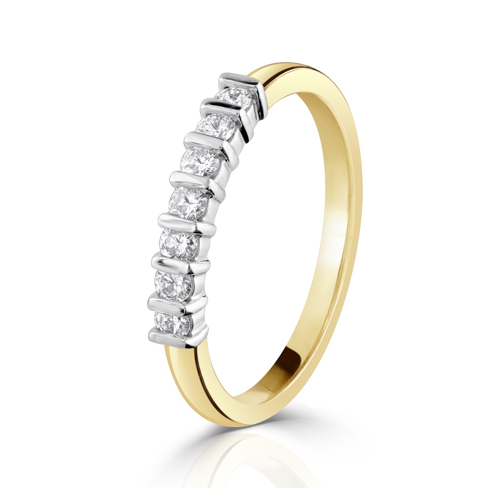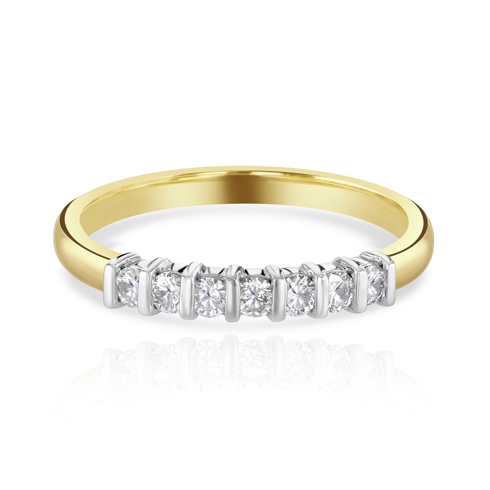 A timeless 18ct yellow gold eternity ring, beautifully crafted to celebrate enduring love. This exquisite ring features seven round brilliant cut diamonds, each meticulously bar-set in 18ct white gold, showcasing a striking contrast. With a total diamond weight of 0.27ct, these diamonds radiate with exceptional clarity and brilliance, making this ring a perfect symbol of everlasting commitment. Ideal for an anniversary gift or a special occasion, this eternity ring blends classic design with contemporary sophistication, ensuring it will be cherished for generations.