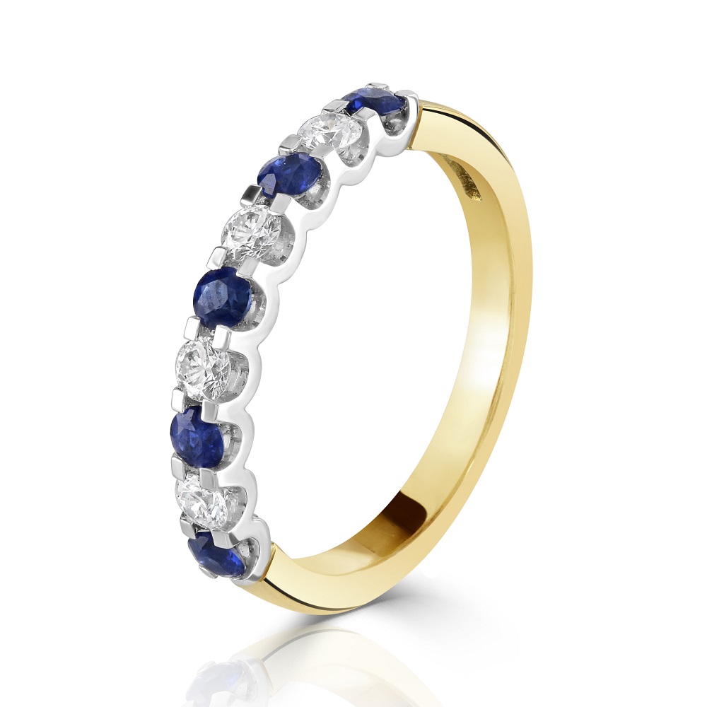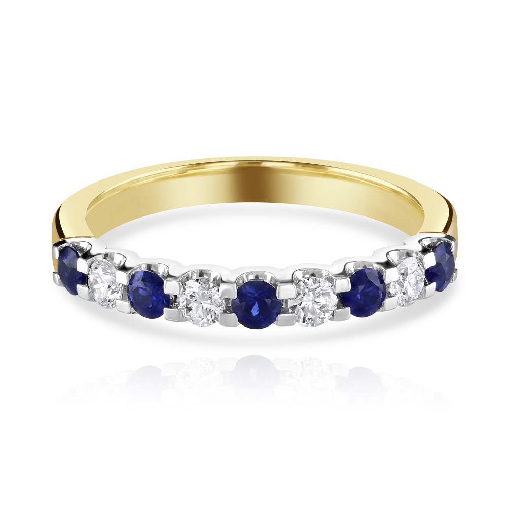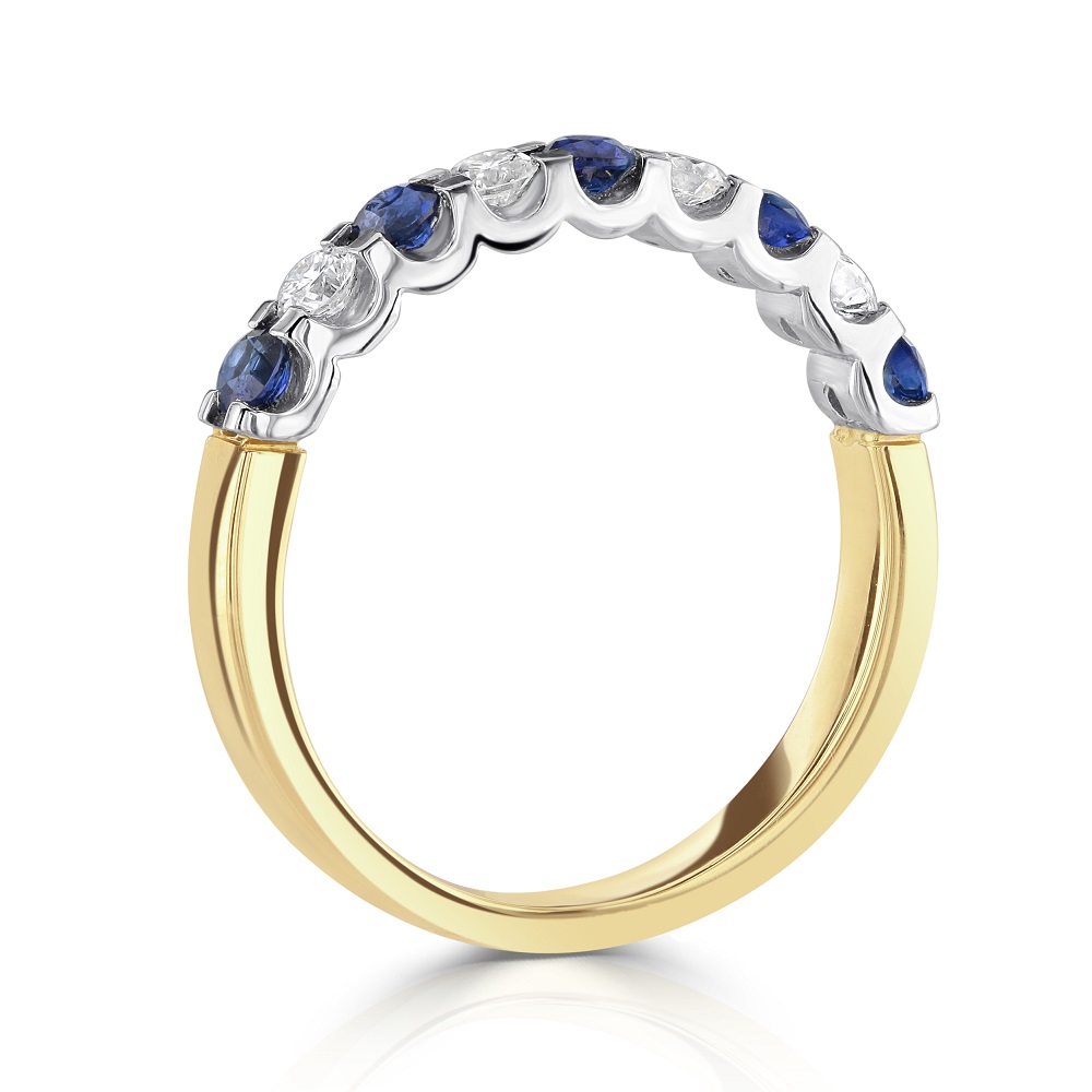 An elegant 18ct yellow and white gold half eternity ring, expertly designed with a seamless cog setting. This stunning ring features an alternating pattern of five round sapphires and four round brilliant-cut diamonds, meticulously set to showcase their vibrant colours and sparkling brilliance.