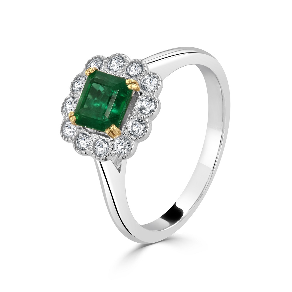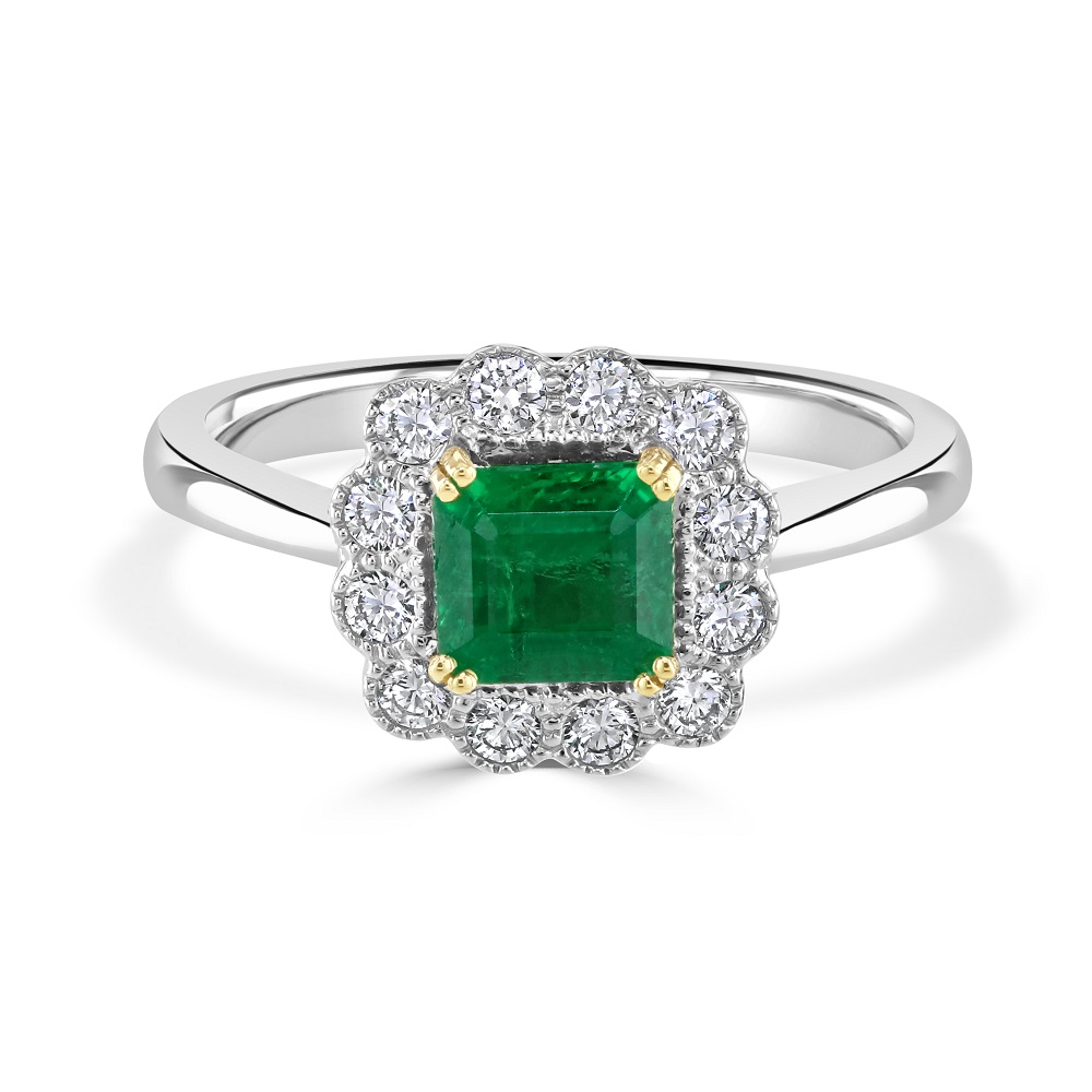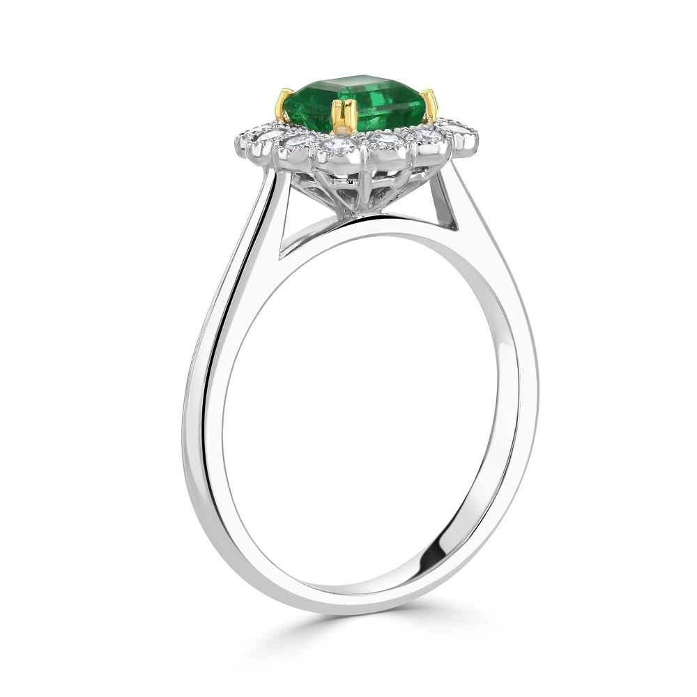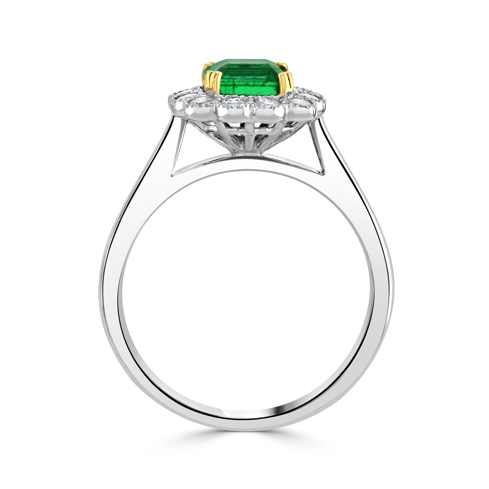 An exquisite 18ct white gold cluster ring, meticulously designed to spotlight a mesmerizing emerald. This captivating gemstone, weighing 0.92ct, is securely nestled within four lustrous 18ct yellow gold claws, showcasing its vibrant hue and exceptional clarity. Surrounding the emerald is a halo of twelve round brilliant-cut diamonds, each rubover set with precision and enhanced by a delicate millegrain edge, adding to the ring's timeless allure. The total diamond weight of 0.41ct perfectly complements the emerald, creating a dazzling display of sparkle and sophistication. Whether it's an engagement, anniversary, or a special gift, this ring symbolizes love and luxury, making it an unforgettable addition to any jewellery collection.
