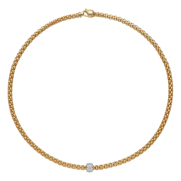 An exquisite 18ct yellow gold Flex'It Solo flexible necklet, a signature creation by Fope Gioielli. This luxurious necklet blends the timeless allure of 18ct yellow gold with the innovative Flex'It design, ensuring both comfort and elegance. At the centrepiece of this sophisticated accessory is a single 18ct white gold rondel, pavé set with sparkling round brilliant cut diamonds, totalling 0.29ct, that radiate with every movement.