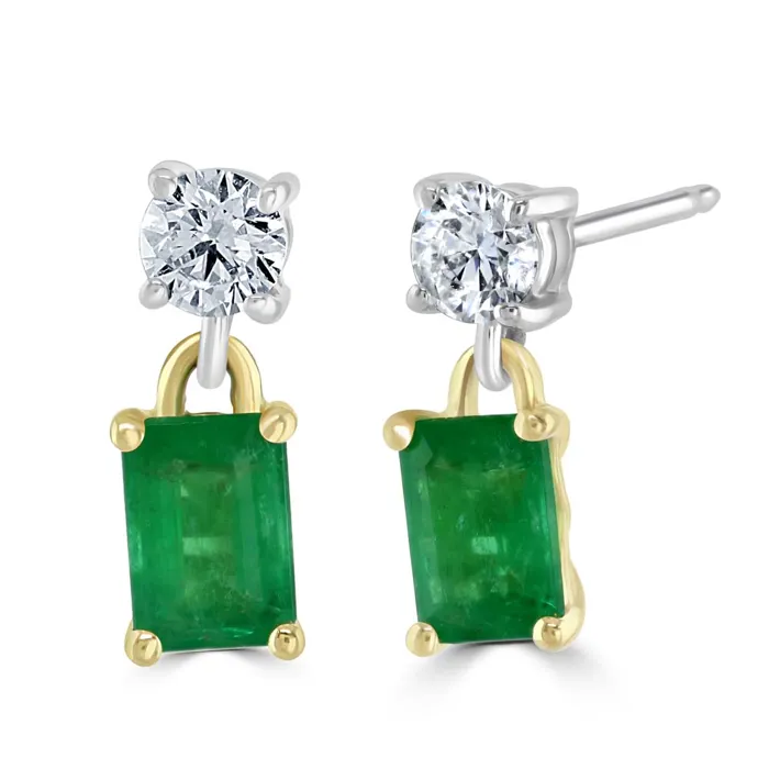 Dangling gracefully beneath each diamond is a captivating octagon cut emerald, each weighing approximately 1.09ct, secured in a four-claw setting of rich 18ct yellow gold. This unique combination of the rich green emerald with the sparkling diamond creates an enchanting contrast, while the blend of yellow and white gold adds a touch of contemporary sophistication.