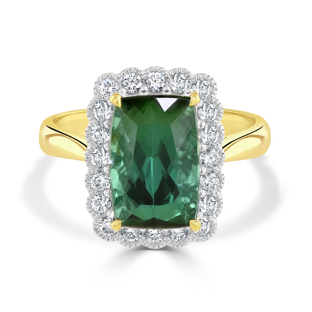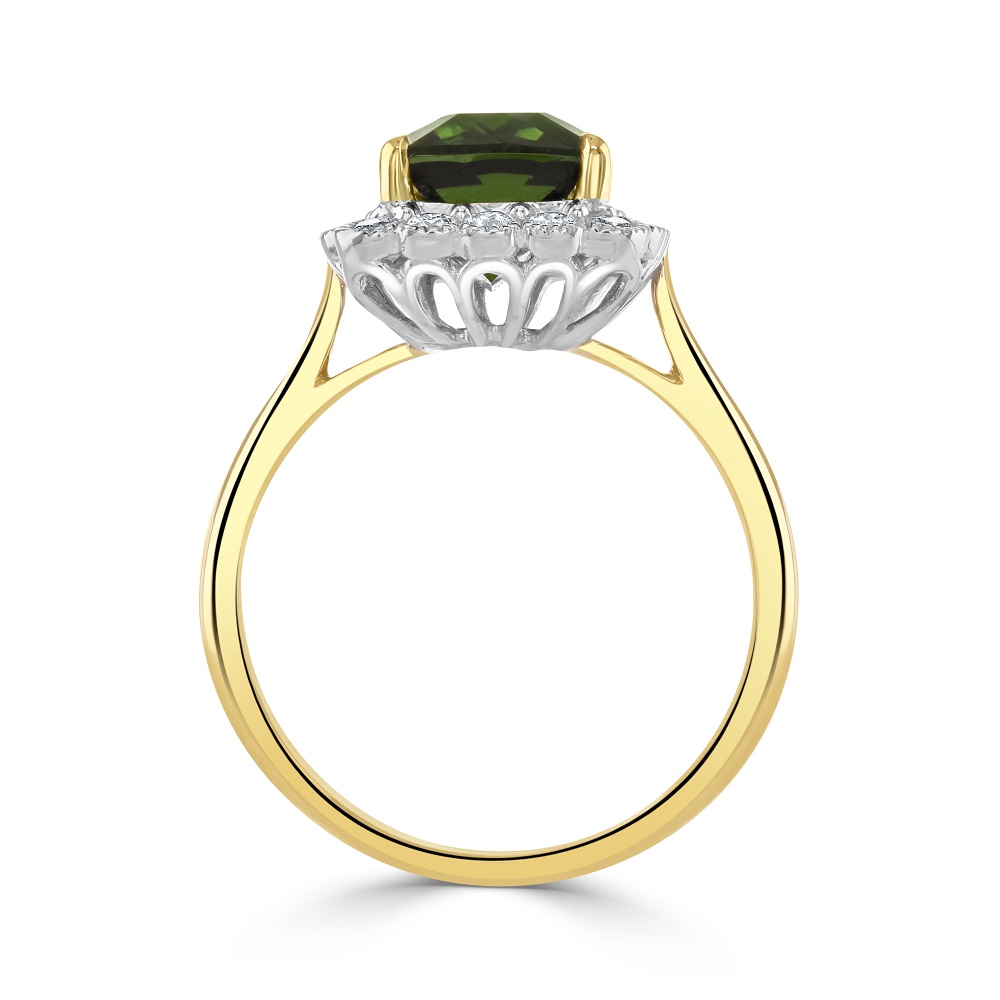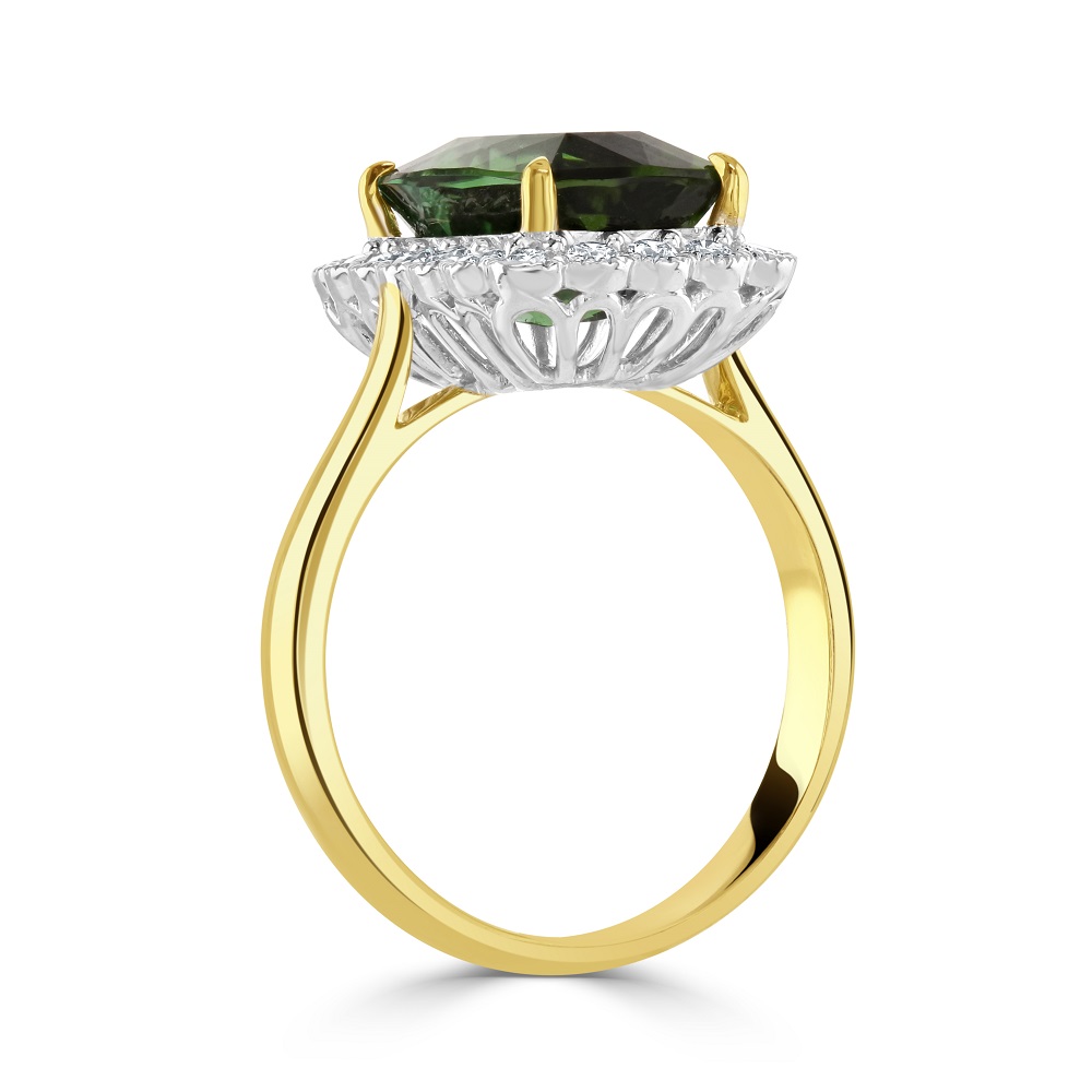 Our luxurious 18ct yellow and white gold cluster Ring, a masterpiece of elegance and sophistication. At the heart of this exquisite piece lies a stunning claw set octagon cut green tourmaline, weighing an impressive 3.91ct. Its rich, vibrant green tones are a symbol of vitality and elegance, making it a captivating centrepiece.