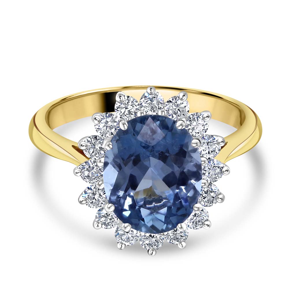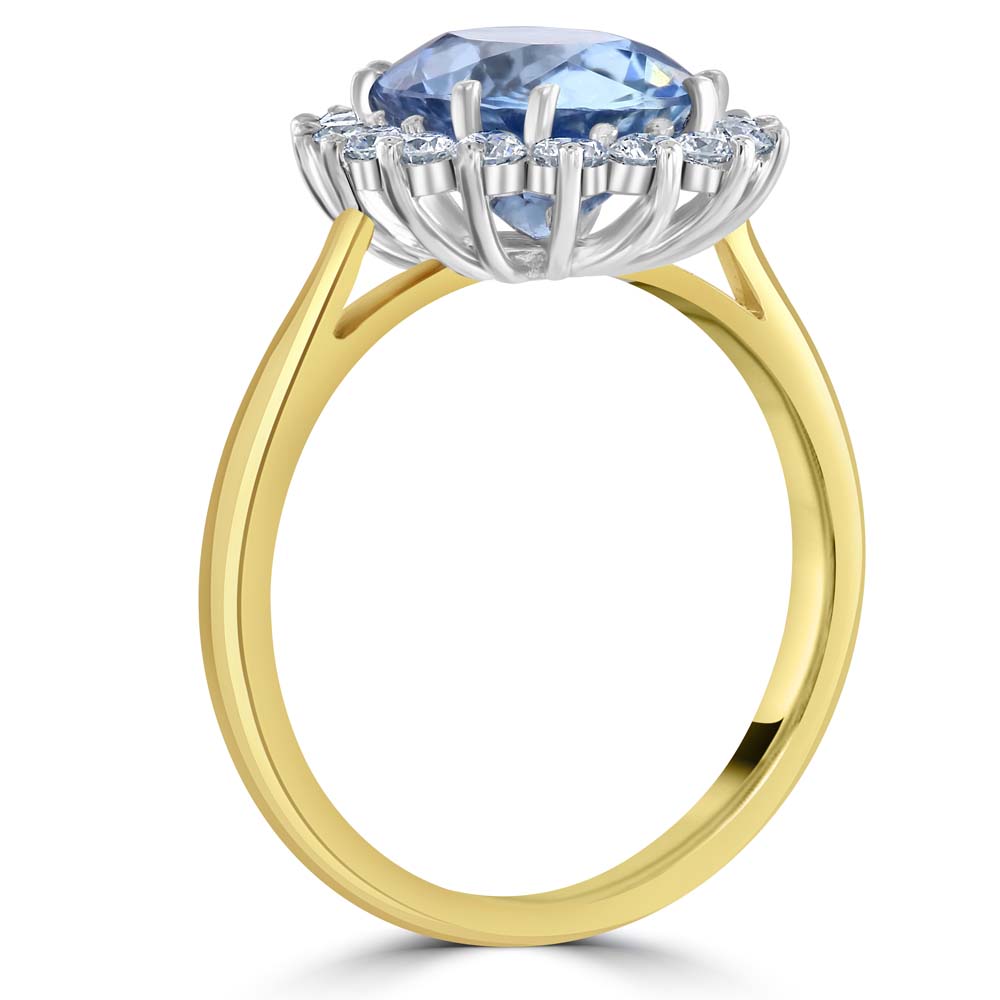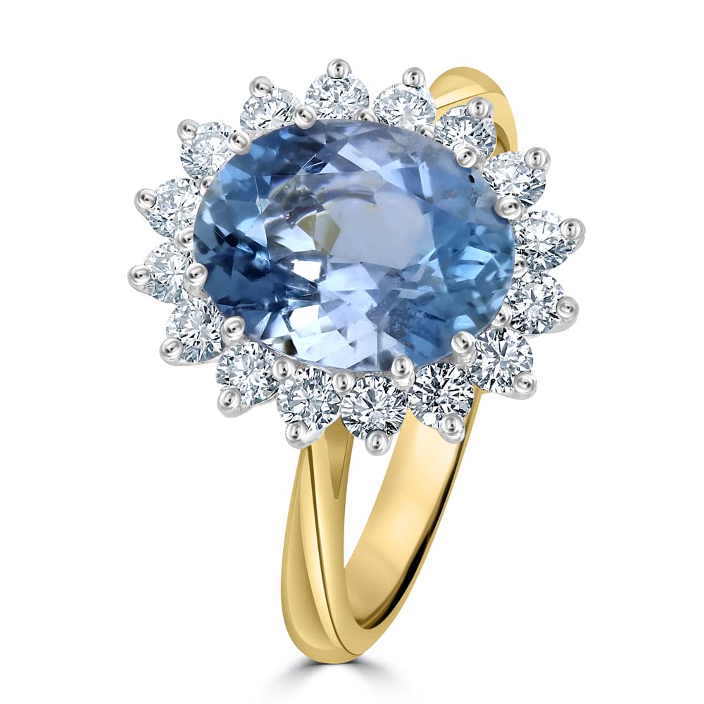 Discover unparalleled elegance with our stunning 18ct yellow and white gold halo ring, masterfully crafted to highlight a magnificent claw-set, oval cut aquamarine centrepiece. This aquamarine gemstone weighs an impressive 2.56 carats and radiates with an enchanting blue hue that captures the essence of the ocean. Encircling this alluring aquamarine are 16 meticulously selected round brilliant cut diamonds that provide a dazzling contrast. These diamonds collectively weigh 0.88 carats and are arranged to enhance the central stone's brilliance and allure. Each diamond has been chosen for its exceptional clarity and colour, ensuring that the ring sparkles with every movement. Whether you're seeking the perfect engagement ring, a memorable anniversary gift, or a luxurious addition to your jewellery collection, this halo ring embodies sophistication and timeless beauty. Make a statement with this exquisite piece that combines the warmth of yellow gold with the modernity of white gold, making it a versatile and cherished addition to any jewellery ensemble.