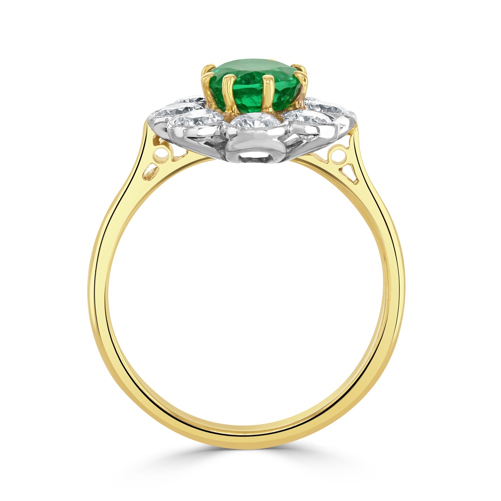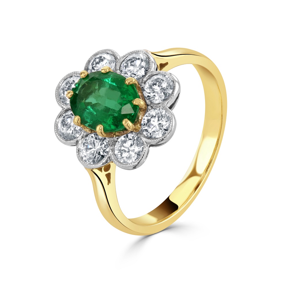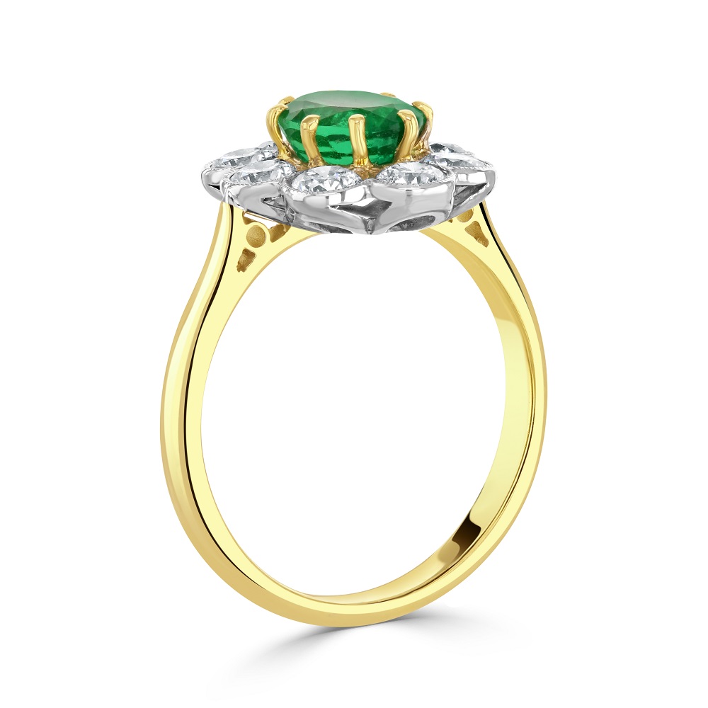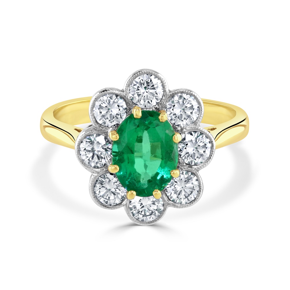 An exquisite 18ct yellow and white gold cluster ring, a masterpiece that merges timeless sophistication with captivating brilliance. At the heart of this enchanting piece lies a mesmerizing oval cut emerald, securely held by claw settings that amplify its lush green hues. This stunning emerald, weighing 1.27ct, is the centrepiece of a design that symbolizes refinement and luxury. Encircling this central gem are 8 round brilliant cut diamonds, each one meticulously placed to enhance the ring's overall sparkle. These diamonds, with a combined weight of 0.99ct, are distinguished by their radiant brilliance, adding an air of opulence to the piece. The diamonds' milgrain edge detailing lends an extra layer of texture and depth, making this ring a true work of art. Crafted with a blend of 18ct yellow and white gold, this cluster ring showcases a harmony of colours that accentuates the beauty of its precious stones. Whether you're looking to commemorate a special occasion or simply wish to add a touch of glamour to your jewellery collection, this ring stands as a symbol of elegance and allure. Its luxurious materials and meticulous craftsmanship make it an heirloom-quality piece that will be cherished for generations to come.