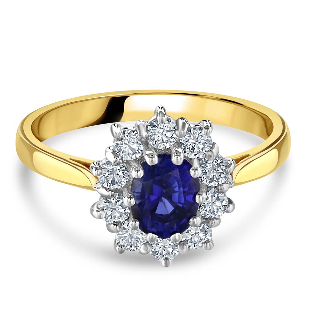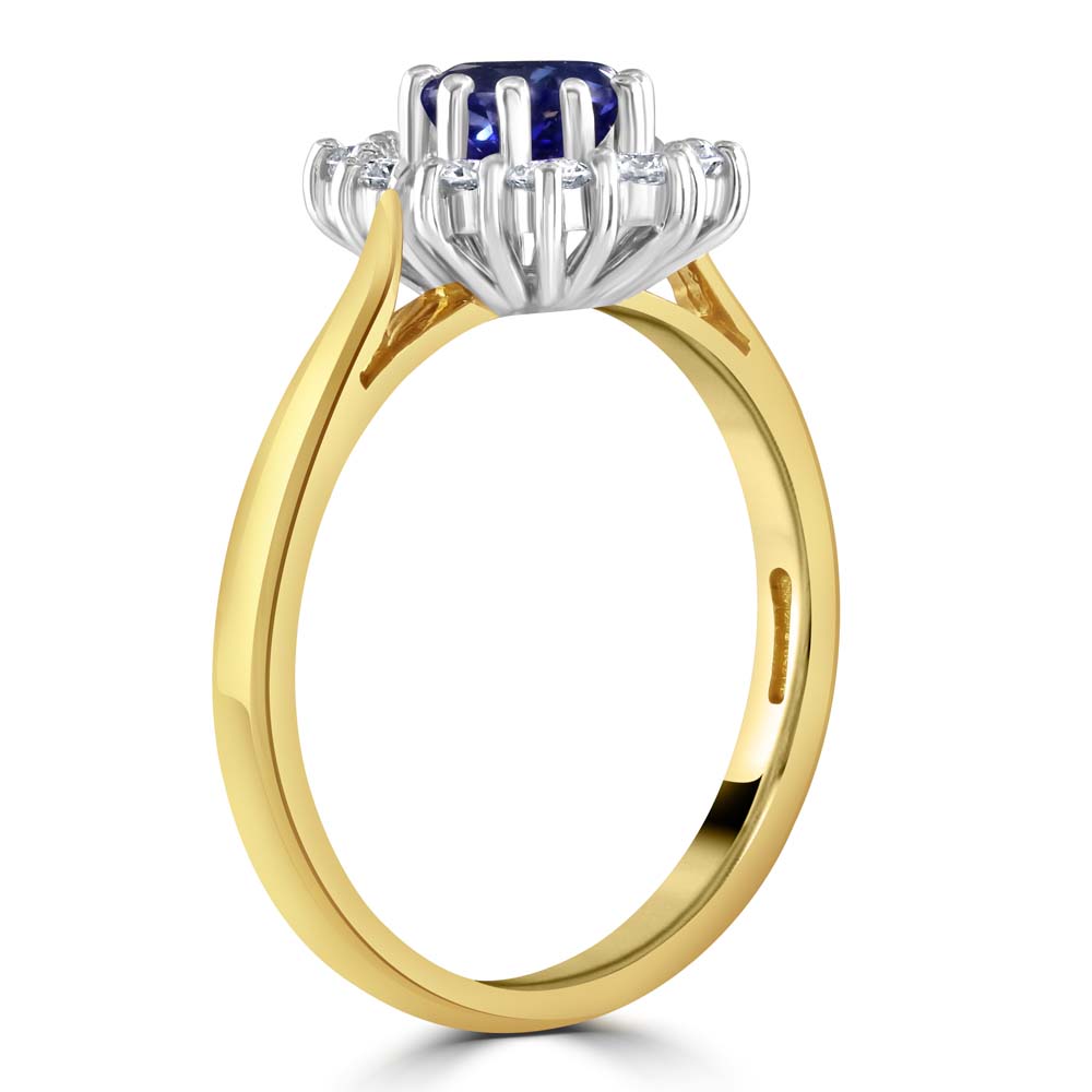 Discover the timeless beauty of our 18ct yellow and white gold cluster ring, featuring a captivating oval cut sapphire at its centre, securely set in a classic claw setting. This stunning sapphire, weighing 0.85 carats, is surrounded by a halo of ten claw-set round brilliant cut diamonds, adding an extra touch of brilliance and elegance. The total diamond weight is 0.43 carats, perfectly complementing the vibrant sapphire. Ideal for celebrating special moments or enhancing your jewellery collection, this 18ct yellow and white gold cluster ring combines luxurious design with exceptional craftsmanship. The rich yellow gold band and elegant white gold settings beautifully enhance the deep blue hue of the sapphire and the dazzling sparkle of the diamonds, creating a piece that symbolizes enduring love and sophistication. Experience the unparalleled beauty and refined artistry of this stunning piece, designed to be cherished for a lifetime.