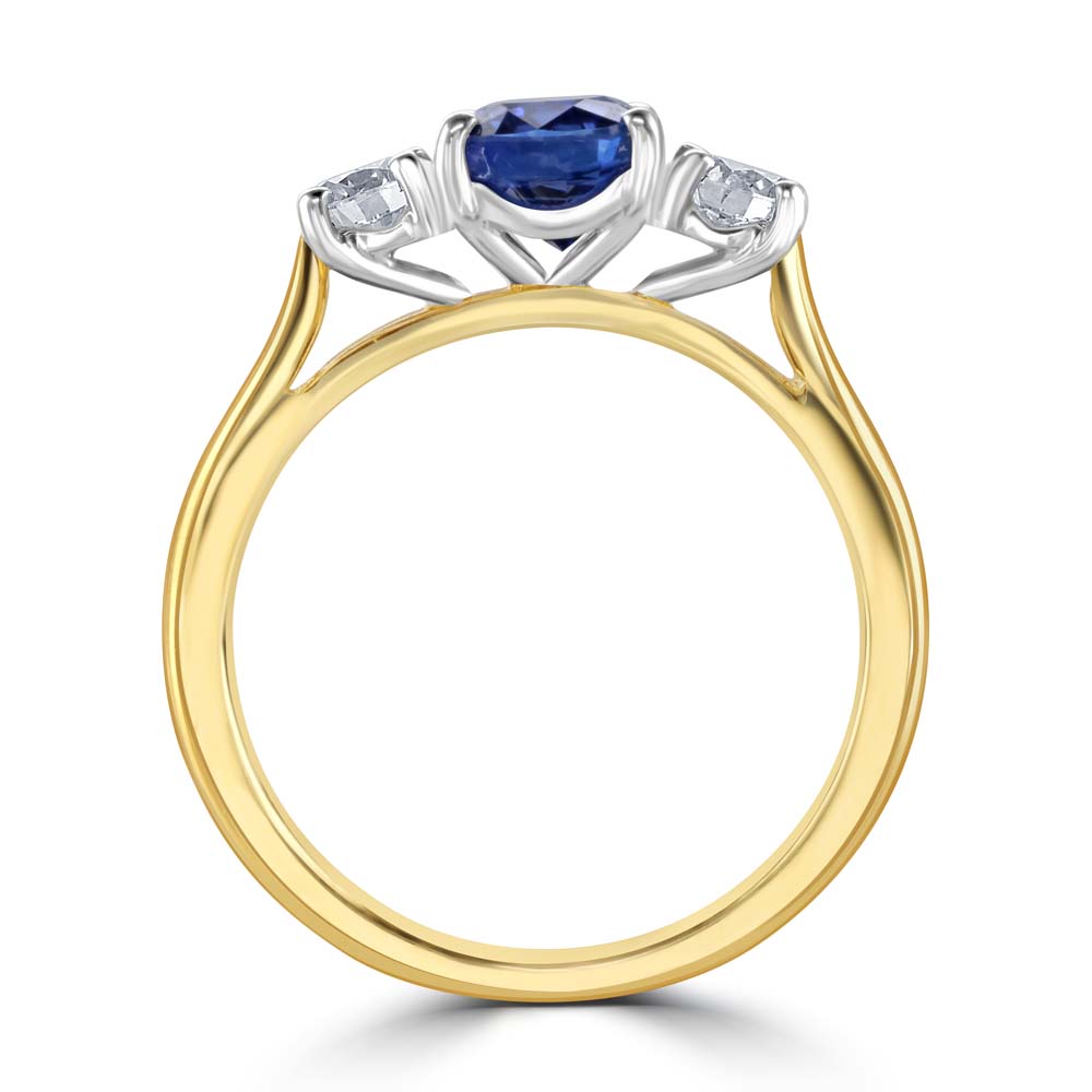 Discover the exquisite beauty of our 18ct yellow and white gold trilogy ring, featuring a captivating oval cut sapphire at its centre, flanked by two round brilliant cut diamonds. The centre sapphire, weighing 1.54 carats, is securely set in a classic 4-claw setting, radiating rich, deep blue hues. On either side, the round brilliant cut diamonds, with a total weight of 0.53 carats, add a dazzling sparkle, each set in elegant 4-claw settings. Ideal for celebrating significant moments or adding a touch of sophistication to your jewellery collection, this 18ct yellow and white gold trilogy ring combines timeless elegance with exceptional craftsmanship. The contrasting yellow and white gold band enhances the beauty of the gemstones, creating a piece that symbolizes enduring love and commitment.