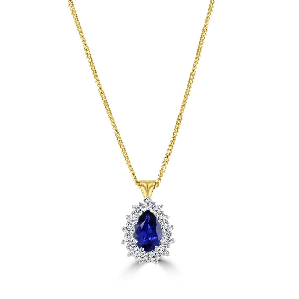 Indulge in the opulence of this exquisite 18ct yellow and white gold pendant. At its heart lies a stunning pear-cut sapphire, weighing 2.02ct, claw set to showcase its deep, captivating blue hue. Surrounding the sapphire are 13 claw set round brilliant-cut diamonds, creating a dazzling halo that enhances the pendant's brilliance and elegance. This luxurious pendant is suspended from an 18ct yellow gold 20-inch curb chain, offering a perfect blend of sophistication and style. With a total diamond weight of 0.81ct, this piece combines the timeless beauty of sapphires and diamonds with the classic appeal of yellow and white gold. Ideal for special occasions or as a cherished gift, this pendant will add a touch of refined elegance to any jewellery collection.