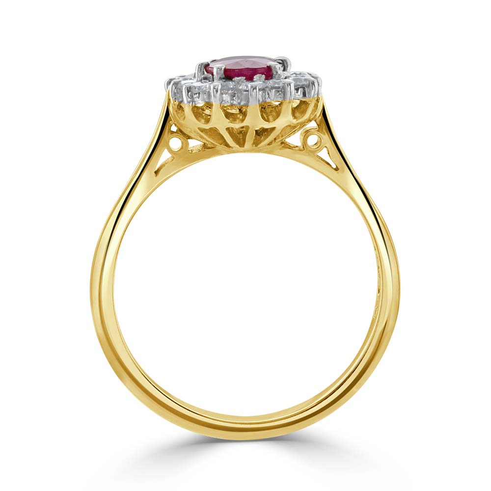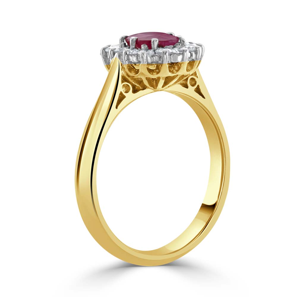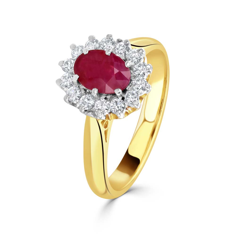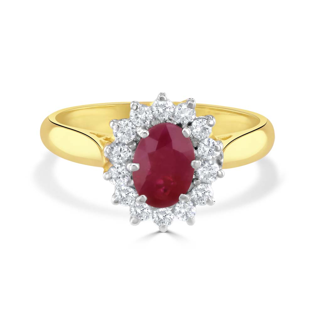 A stunning 18ct yellow and white gold oval ruby and diamond cluster ring. This exquisite piece features a centrally positioned oval ruby, elegantly claw-set and weighing approximately 0.85 carats. The ruby's vibrant red hue is perfectly highlighted by a halo of 14 round brilliant-cut diamonds, also in claw settings, adding an additional sparkle with a total weight of about 0.35 carats. The ring's band is crafted in smooth, polished yellow gold, providing a striking contrast to the white gold setting of the gemstones, creating a sophisticated blend of colours and textures. This ring is a testament to classic elegance and modern design, making it an ideal choice for anyone looking to add a touch of luxury and timeless appeal to their jewellery collection. Perfect for special occasions or as a cherished gift, this ruby and diamond cluster ring promises to enchant and delight.