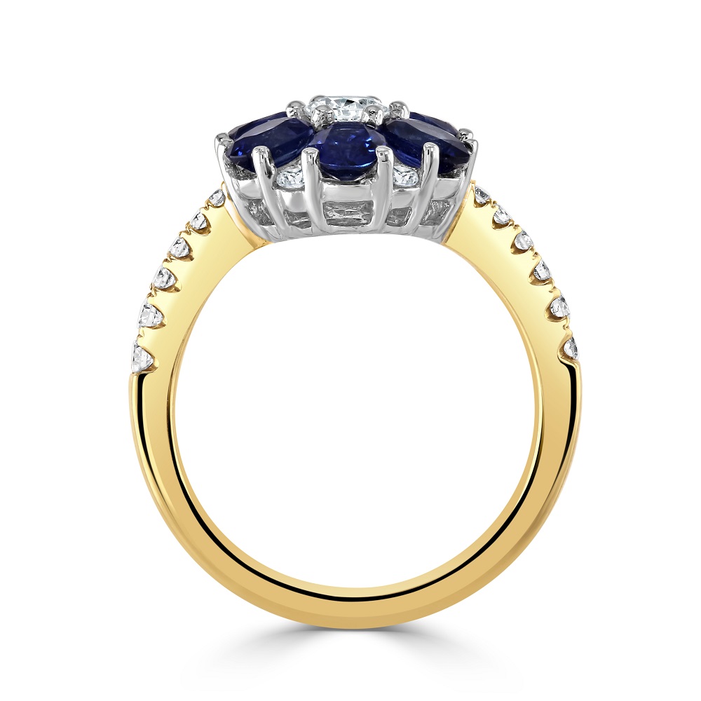 An enchanting 18ct yellow gold cluster ring, an exquisite addition to our fine jewellery collection. This ring showcases a captivating design with six oval sapphires, totalling 1.81 carats, and seven round brilliant cut diamonds arranged in a floral 'petal' pattern. At the centre, a single round brilliant cut diamond adds a luminous focal point, brilliantly complemented by diamond-set shoulders for additional sparkle.