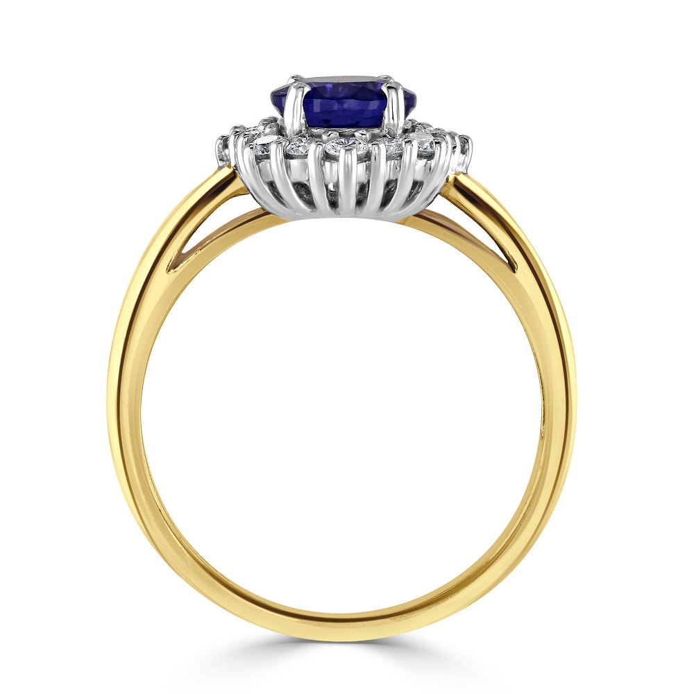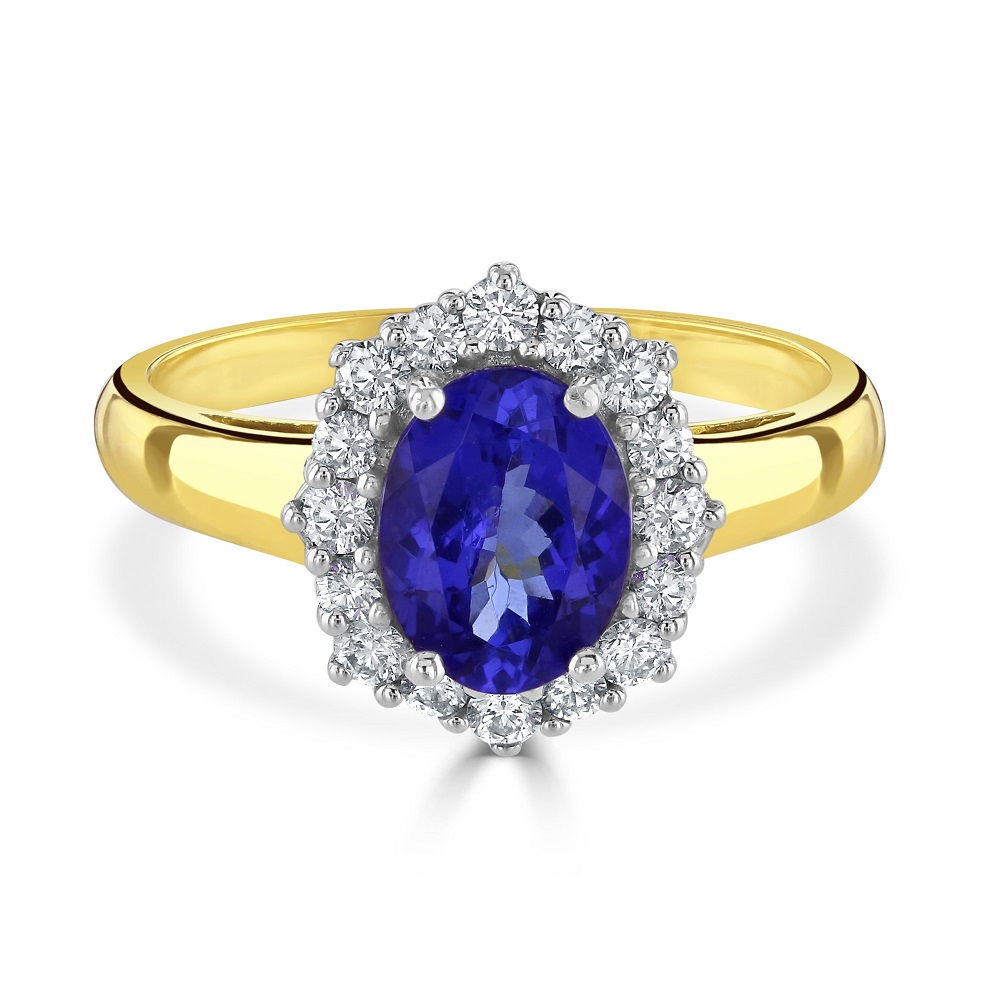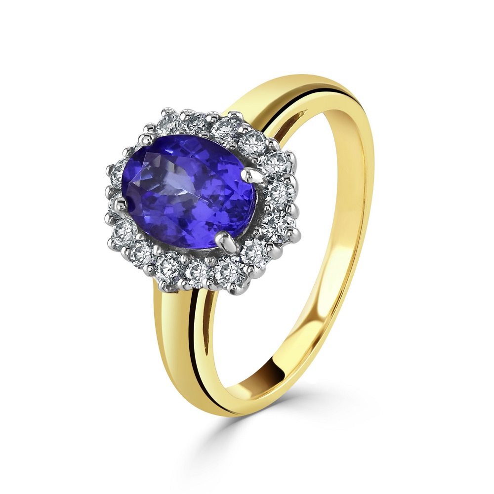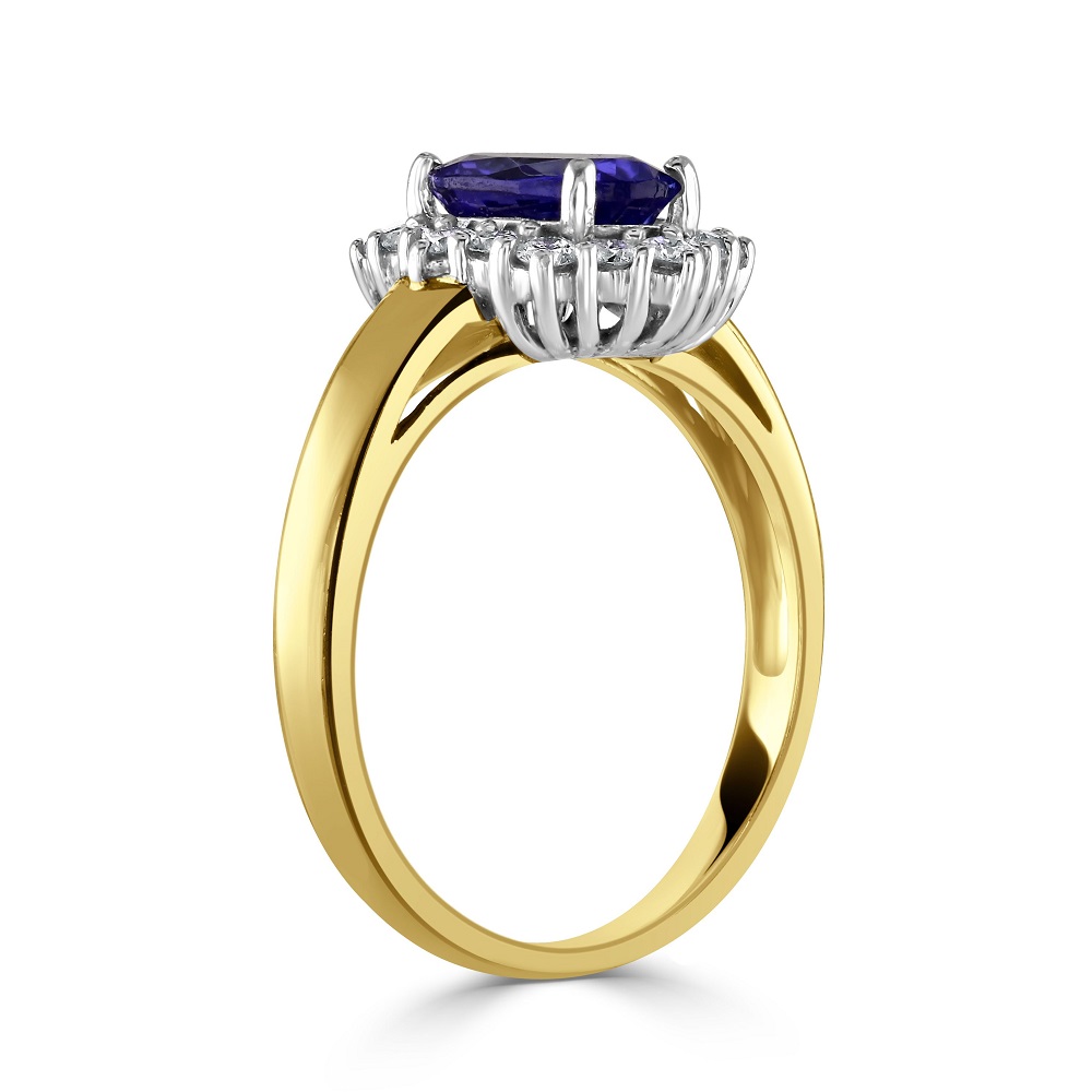 A luxurious 18ct Yellow gold cluster ring, meticulously crafted with an exquisite oval cut Tanzanite, weighing 1.39cts, at its centre. This captivating Tanzanite is elegantly claw-set in 18ct white gold, beautifully complemented by a halo of 16 round brilliant cut diamonds, collectively weighing 0.32cts, also claw-set in 18ct white gold for maximum brilliance. The stunning contrast between the rich yellow gold band and the luminous white gold setting highlights the deep, enchanting blue of the Tanzanite, making it a standout piece. This ring is a celebration of exquisite craftsmanship and elegant design, tailored for those who appreciate the luxury and allure of fine gemstones and diamonds. The unique blend of colours and textures makes this ring a perfect choice for special occasions or as a glamorous addition to any jewellery collection. Embrace the sophistication and timeless beauty of this cluster ring, where the allure of Tanzanite and the sparkle of diamonds are seamlessly combined to create a masterpiece of fine jewellery.Top of Form