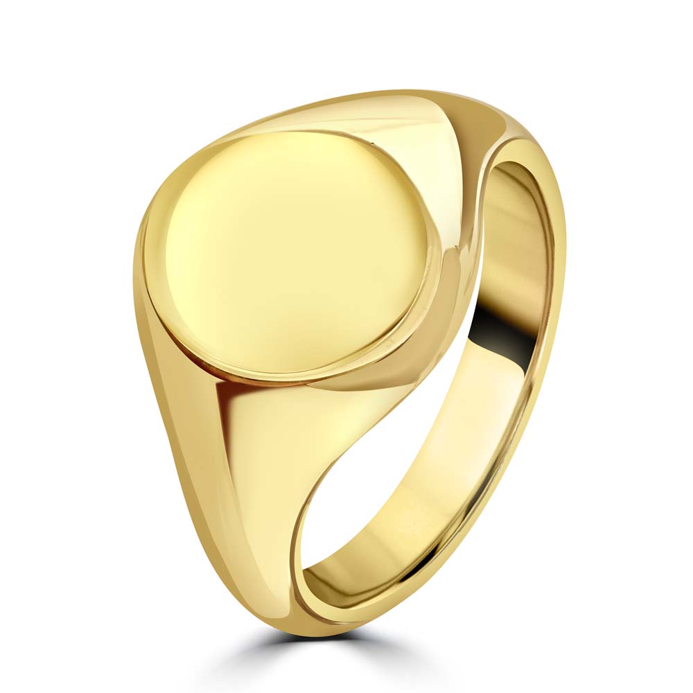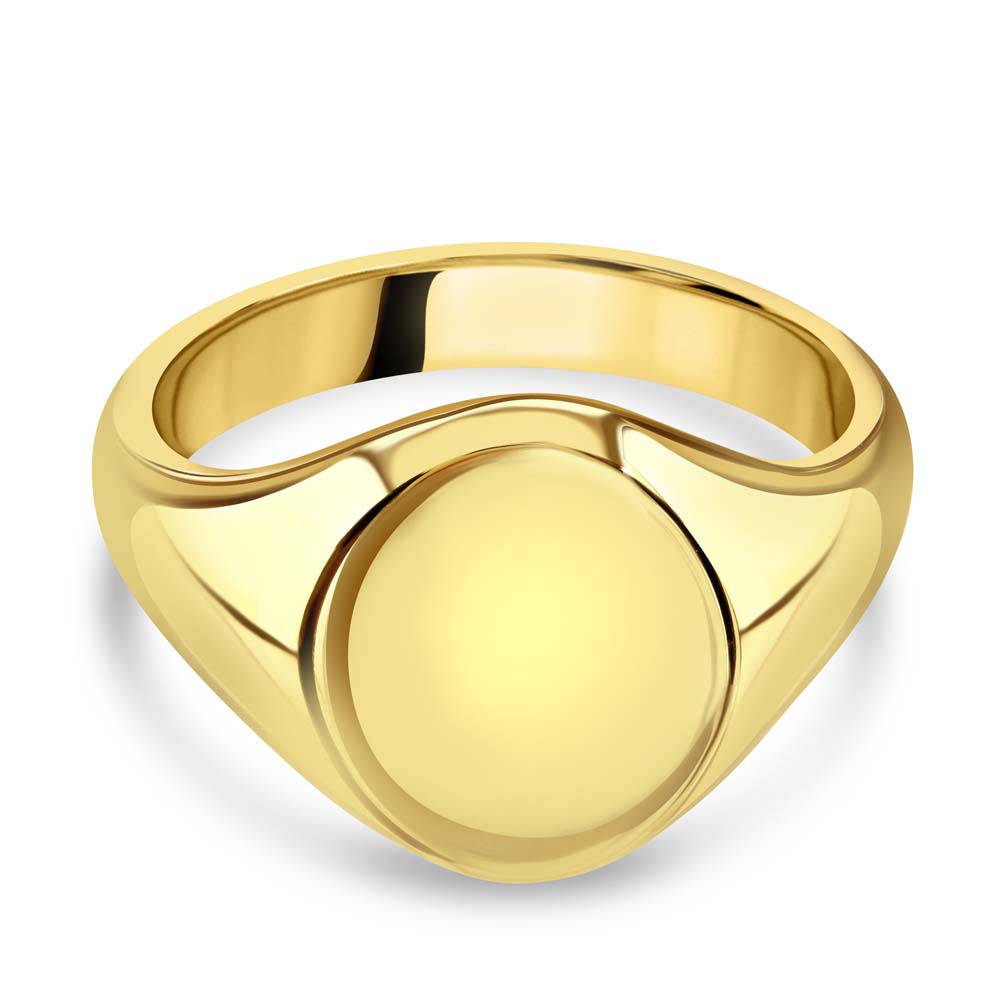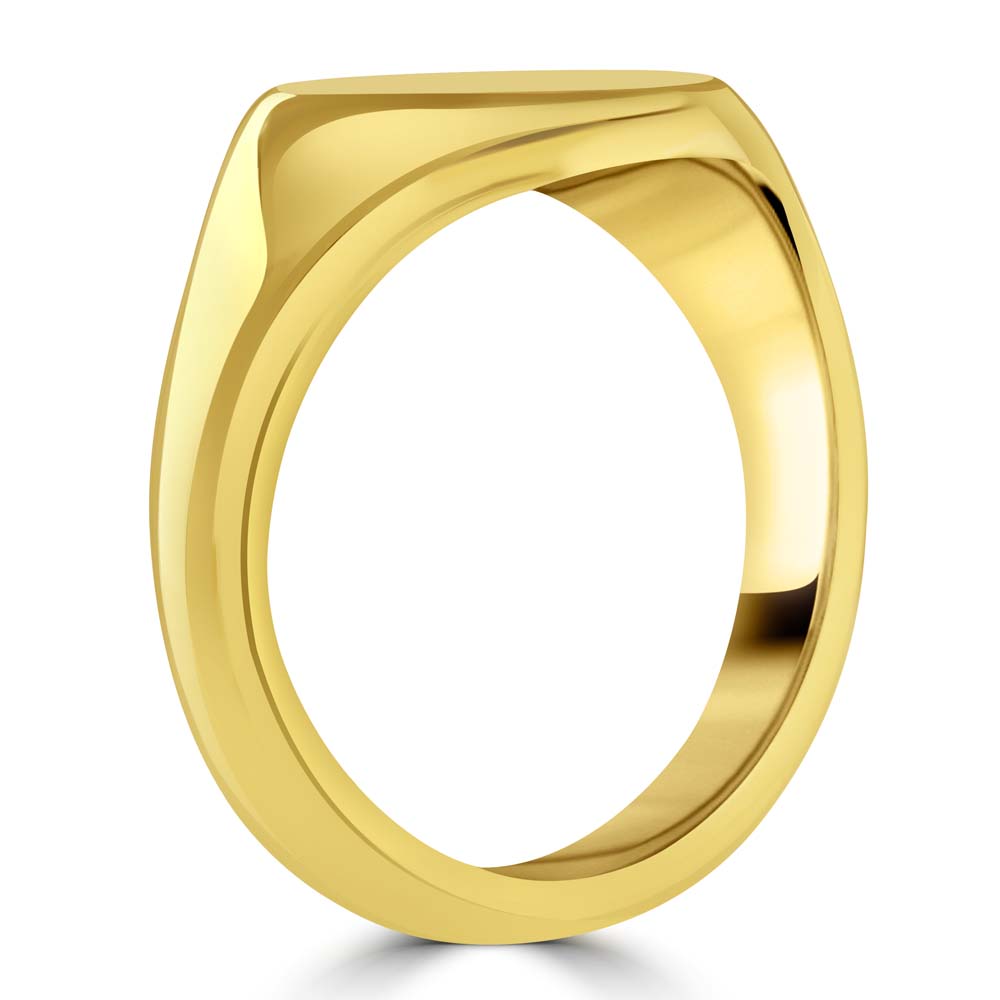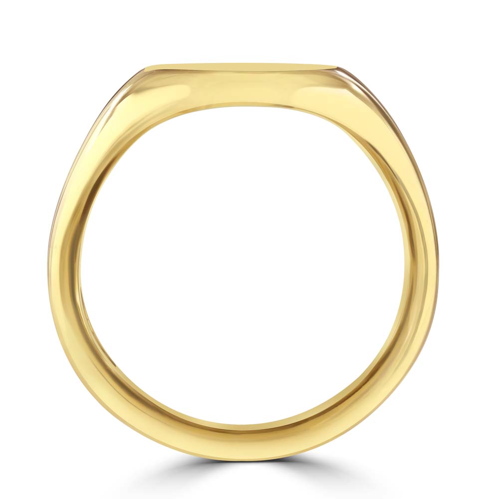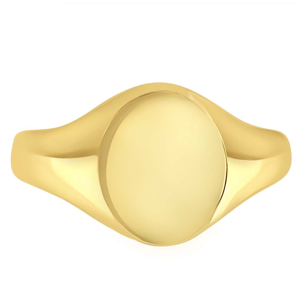 A 9ct yellow gold oval shaped signet ring, a symbol of refined taste and personal heritage. This exquisite piece is perfectly designed for seal engraving, allowing you to customize it with your family crest or initials, making it a profound expression of your identity and legacy. Crafted from luxurious 9ct yellow gold, this signet ring features a sleek, cushion-shaped face that provides a canvas for personalization while maintaining a classic and sophisticated profile. Ideal for those who appreciate the significance of heritage and the importance of individuality, this ring is not just a piece of jewellery, but a personal emblem that can be treasured for generations.