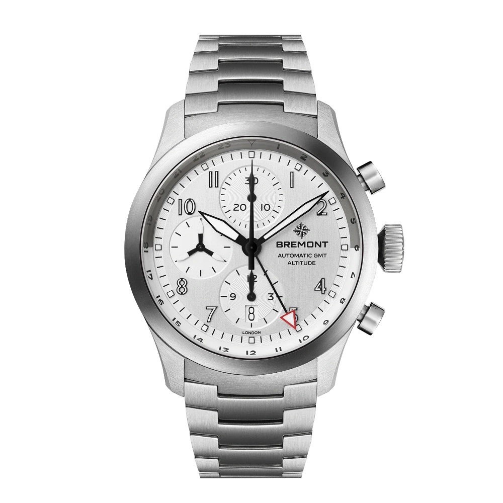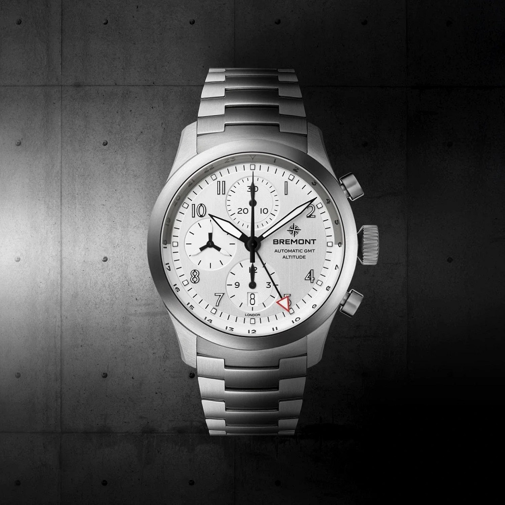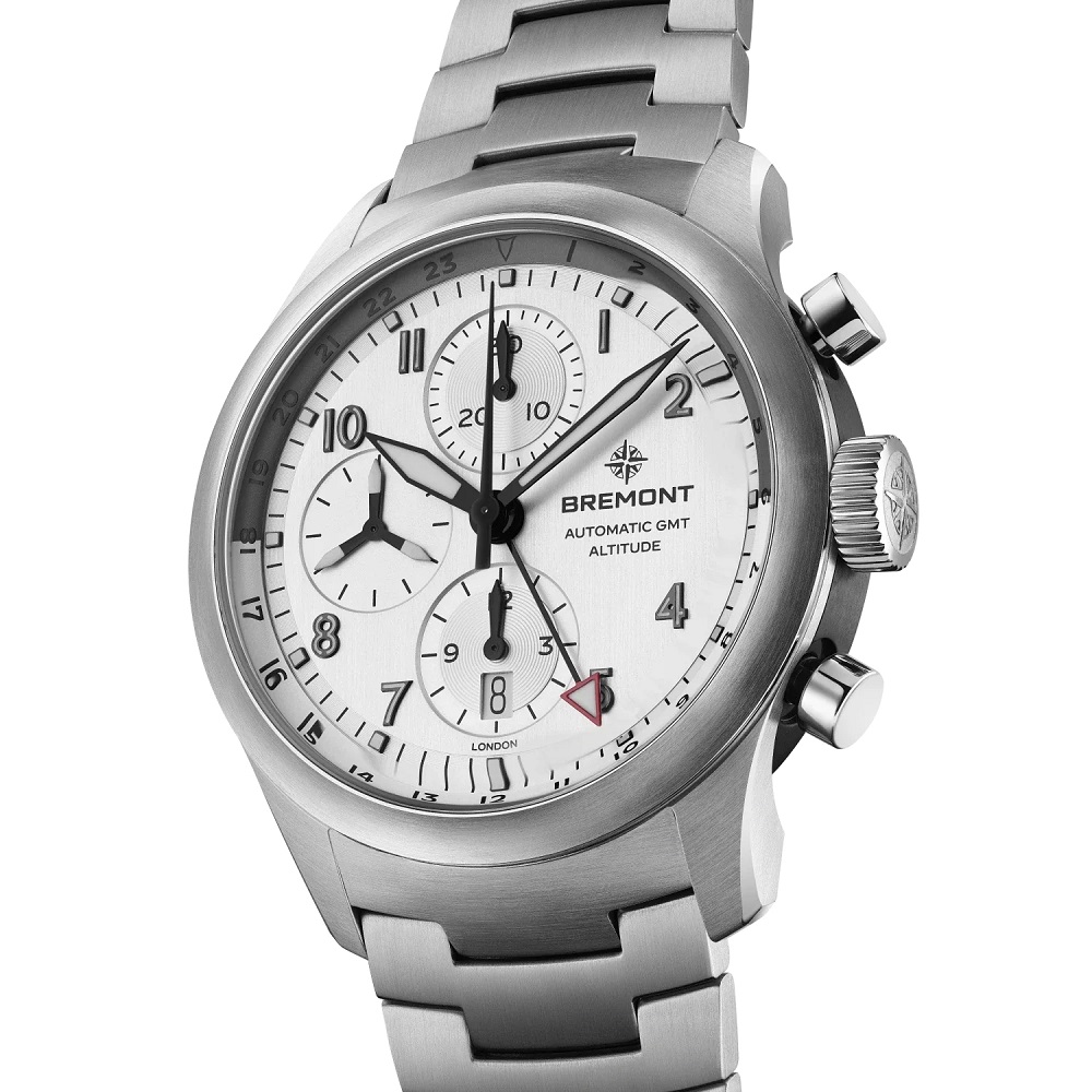 The Altitude Chronograph GMT is the ultimate evolution of Bremont’s aviation tool watch — combining the proven resilience of the MB series with the added functionality of a chronograph and GMT complication. The dial design is clean, legible, and cockpit-inspired, with applied Super-LumiNova® numerals and indexes, and recessed chronograph subdials. A red-tipped GMT hand tracks a second time zone against a 24-hour day/night scale, while the rotating seconds subdial at 9 o’clock takes the form of a tri-blade propeller — a nod to a Bremont military project.