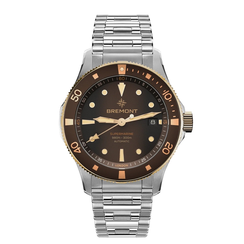 Introducing the Supermarine 300m Date Bi-Colour, featuring a sleek profile case shape crafted in 904L stainless steel and 18ct rose gold. The 18ct rose gold-capped, knurled-edged bezel showcases trapezoid indexes on the uni-directional brown aluminum insert, seamlessly transitioning onto the dial to form a naval-inspired crosshair that draws the eye to the striking brown gradient dial.