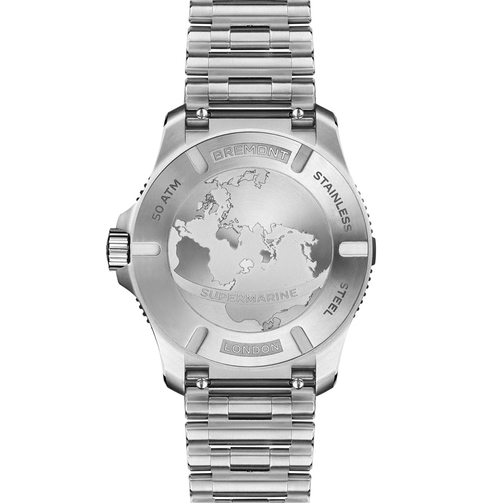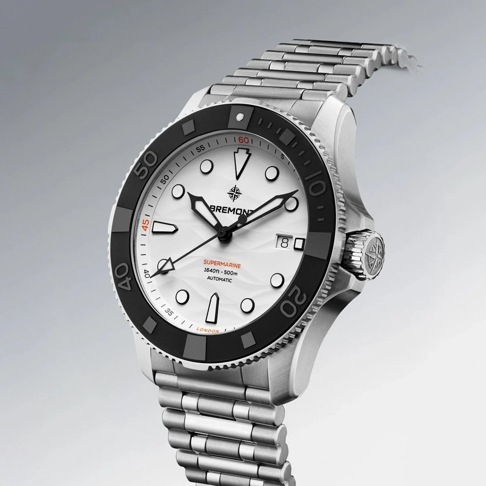 The Supermarine 500m marks a bold new chapter in Bremont’s professional dive watch collection. Crafted in 904L stainless steel, the 43mm case features a slimmer, more ergonomic profile with enhanced crown and bezel guards for added durability. Designed to withstand the pressures of deep-sea diving, it boasts a 500-metre water resistance rating, a helium escape valve, and a textured black ceramic uni-directional bezel.