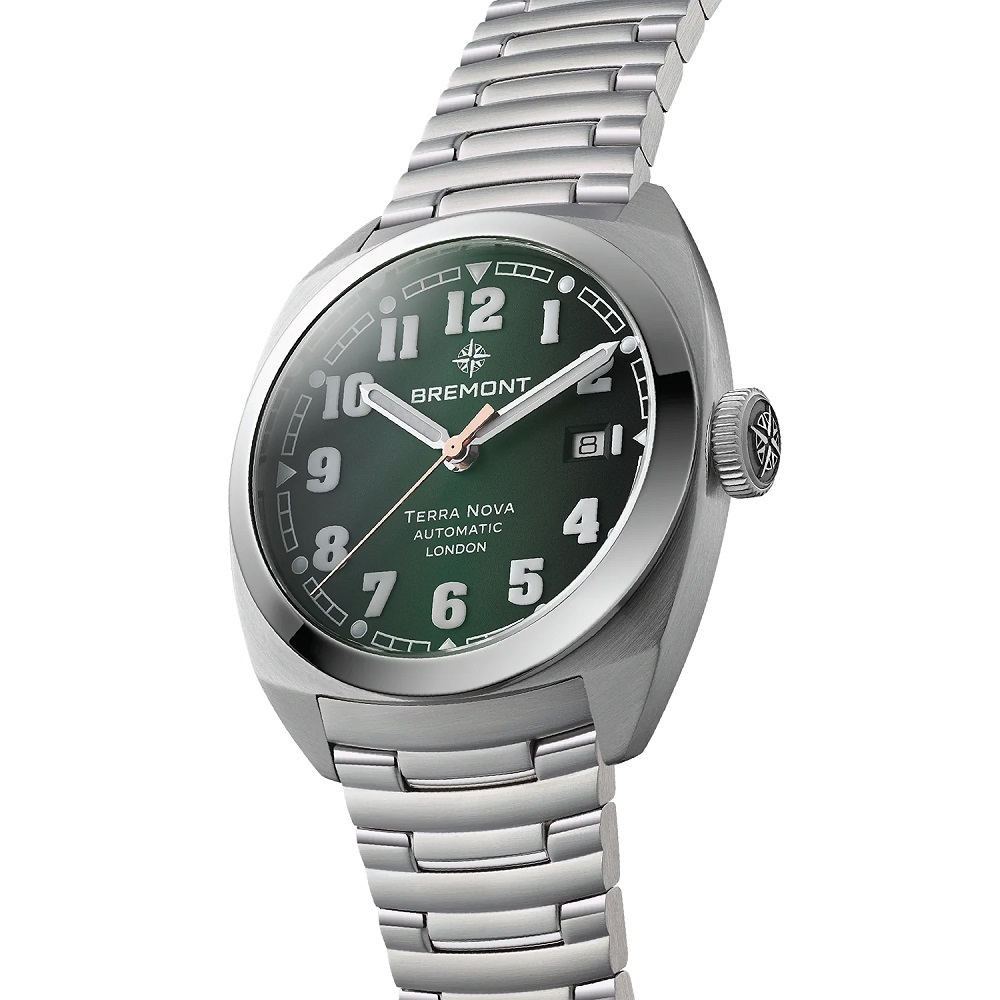 The Terra Nova field watch in 40.5mm with date function. The unique modern geometric cushion case with its low profile and shortened lugs has been crafted to sit perfectly on the wrist with great balance and presence.