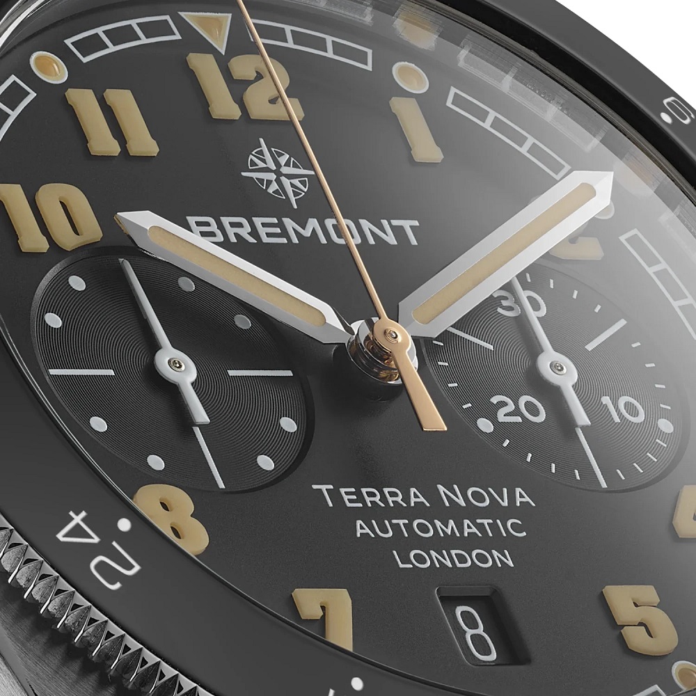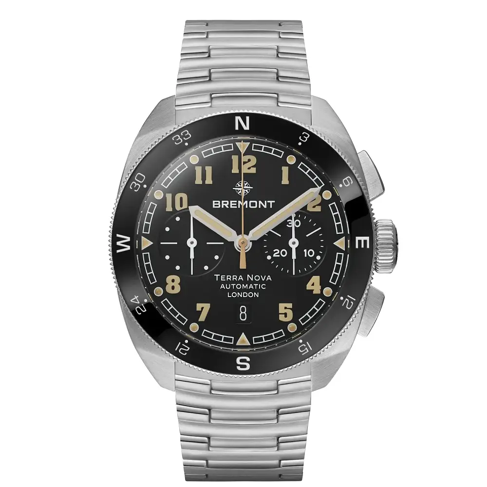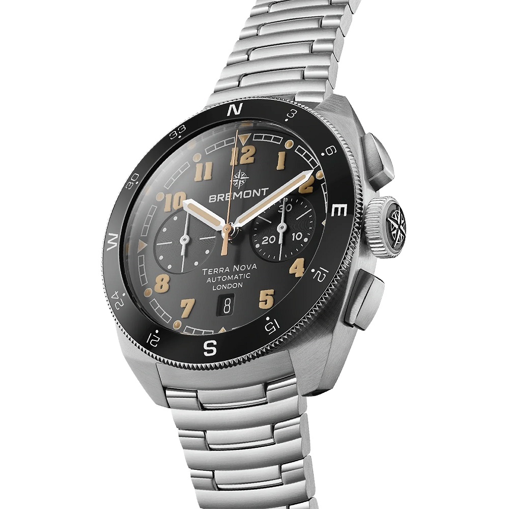The Terra Nova 42.5mm Chronograph is a two counter chronograph featuring a polished ceramic bi-directional compass bezel.
